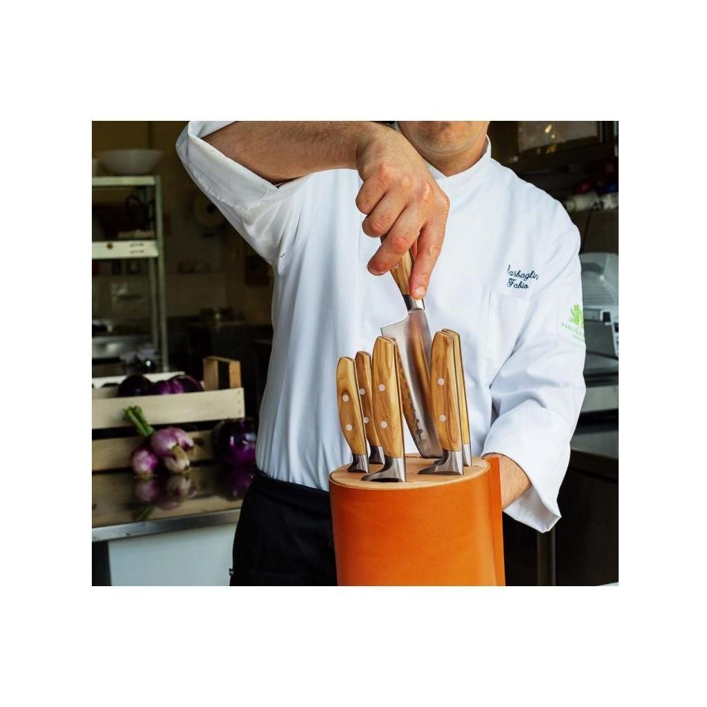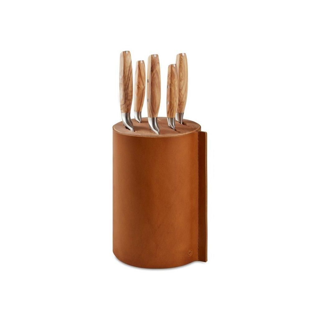 Blok na nože Wüsthof Amici je štýlovým doplnkom nielen pre nože Amici s čepeľou z vysoko kvalitnej nehrdzavejúcej ocele a jedinečnou kresbou drevenej rukoväte. Je vhodný pre 6 nožov a bol vyrobený v Nemecku z bukového dreva obaleného prírodnou kožou.