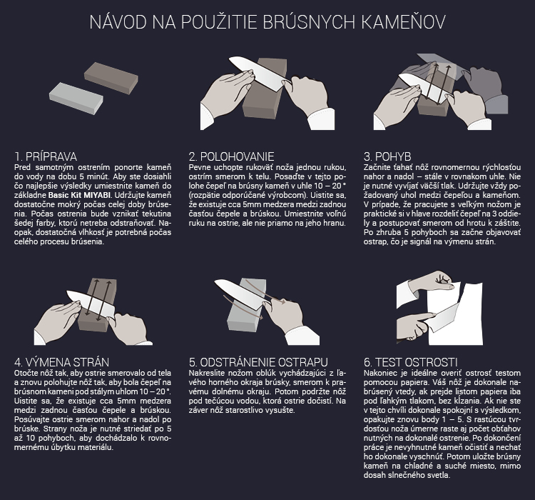 Dokonca aj ten najlepší nôž stratí priebehom času svoju pôvodnú ostrosť. Preto je nutné nože priebežne brúsiť či udržovať ich ostrosť. S použitím správnej techniky a brúsnych kameňov či brúsok MIYABI bude táto úloha jednoduchá.