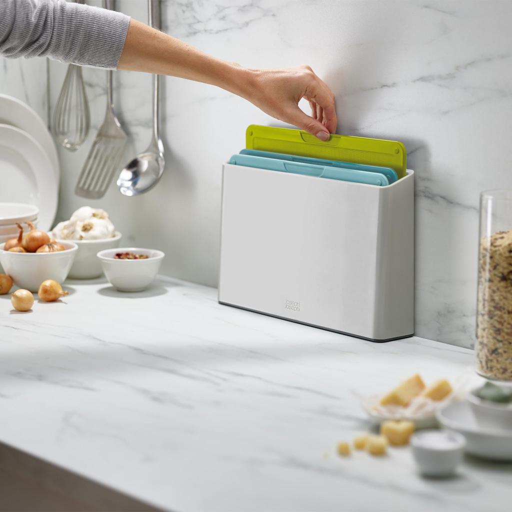 - Štíhly stojan udržuje všetky dosky prehľadne usporiadané na jednom mieste a šetrí cenný priestor na kuchynskej linke.