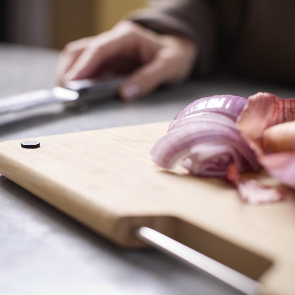 - Protišmykové nožičky na spodnej strane dosiek zaisťujú stabilitu pri krájaní a pomáhajú udržať dosku pevne na pracovnej ploche.