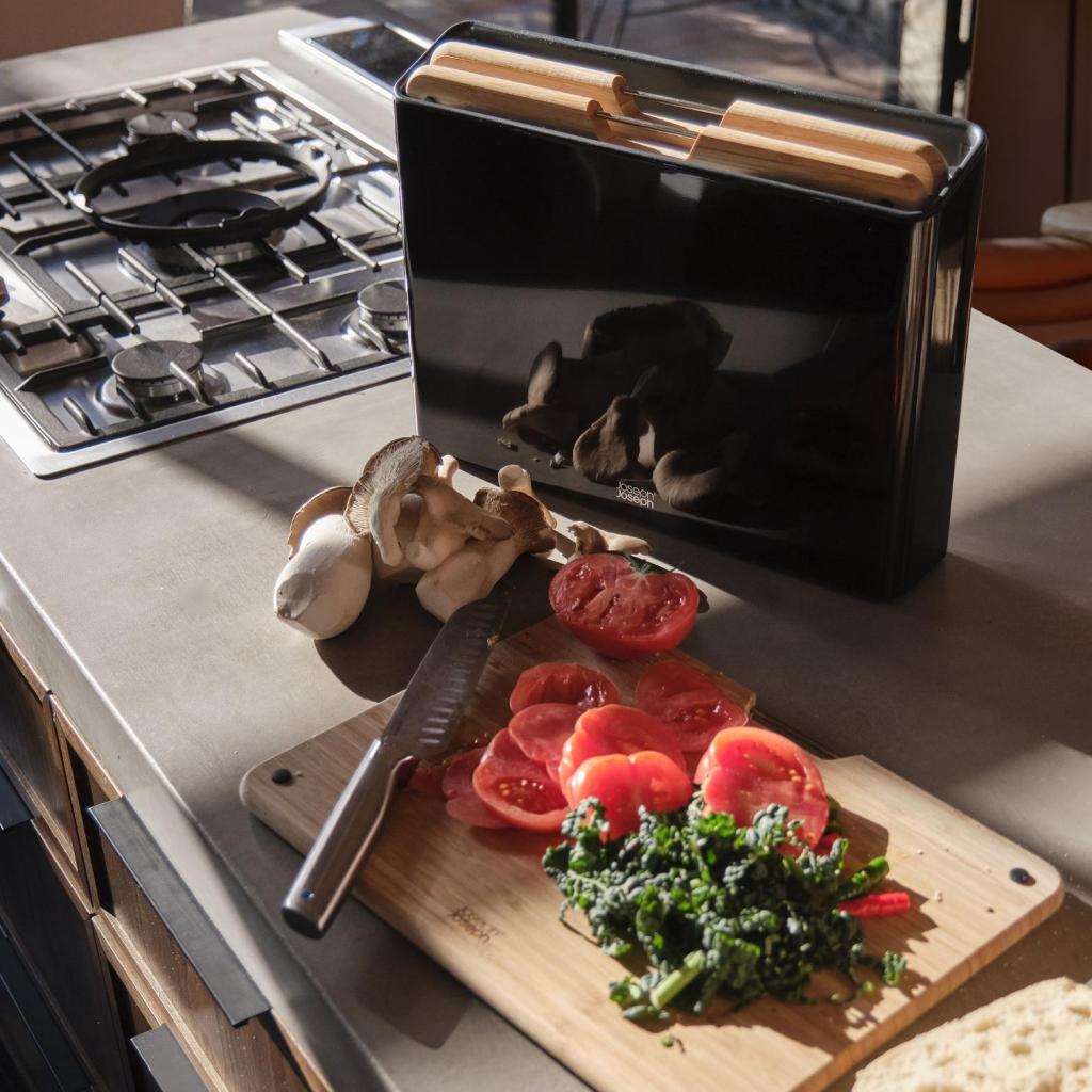 - Moderný stojan z nehrdzavejúcej ocele v čiernom vyhotovení poskytuje kompaktný úložný priestor, ktorý pomáha udržať doštičky prehľadne uložené na kuchynskej doske.