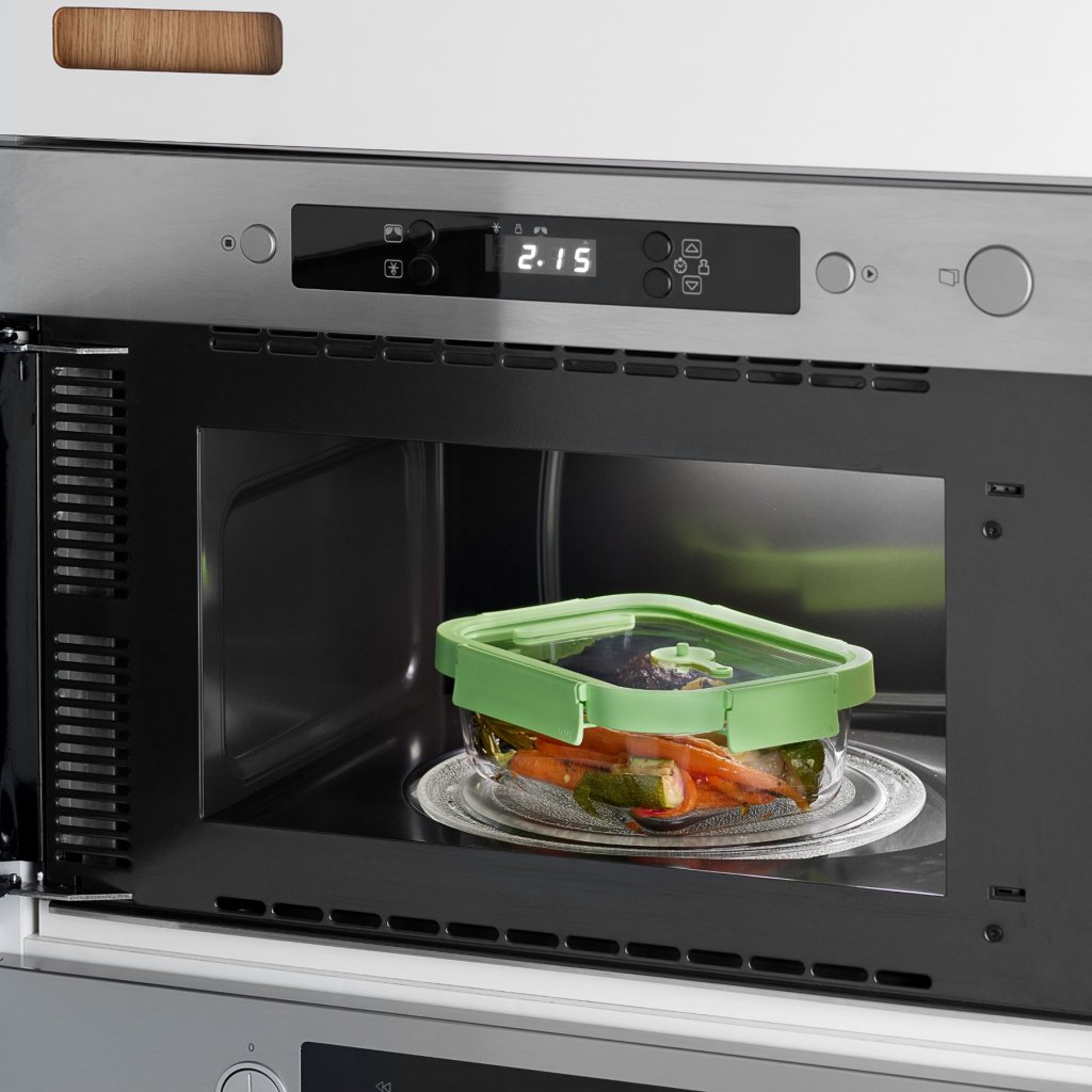 - integrovaný ventil na ohrievanie jedla v mikrovlnnej rúre bez nutnosti odstrániť veko