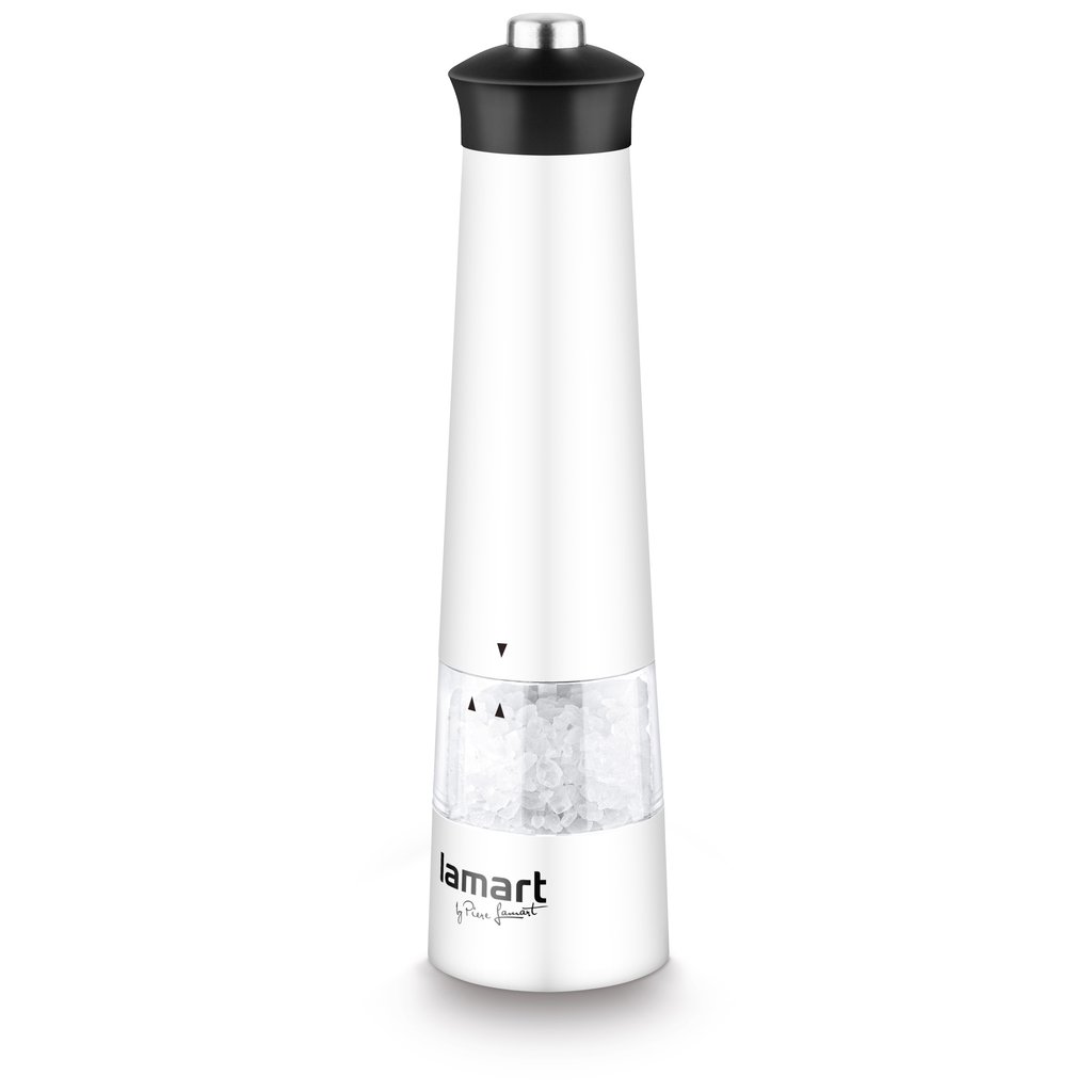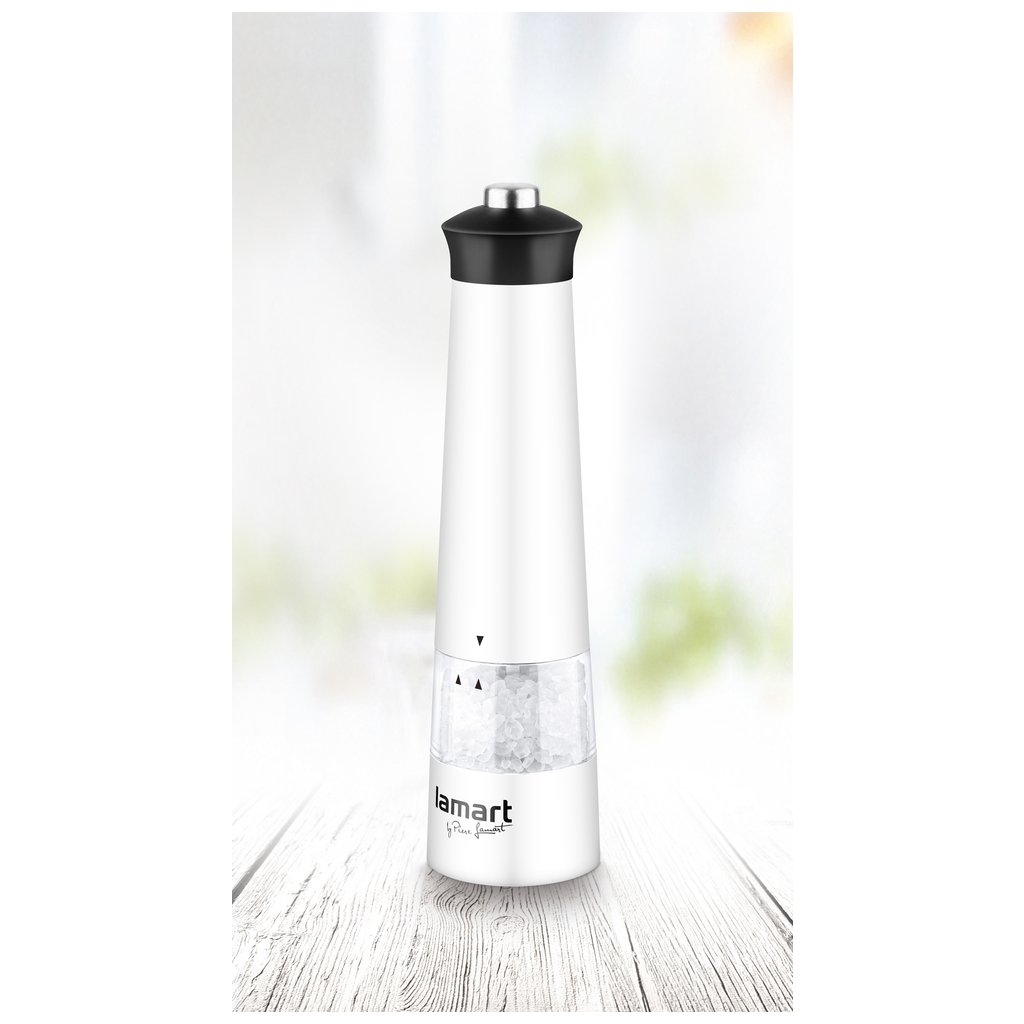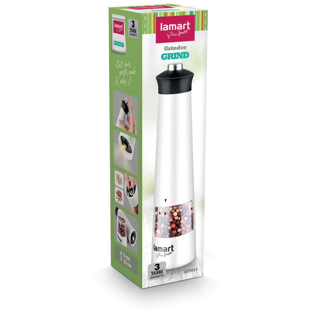 Elektrický mlynček značky Lamart je určený na celé korenie alebo soľ. Je vyrobený z jemného materiálu a keramický mechanizmus má nastaviteľnú hrubosť mletia. Priehľadný zásobník na korenie vám umožní sledovať množstvo korenia v mlynčeku, aby ste mohli včas dokúpiť nové. Ovládanie je veľmi jednoduché a intuitívne, stačí stlačiť a podržať tlačidlo na mlynčeku. Motor brúsky funguje na 4 batérie AAA, ktoré nie sú súčasťou balenia. Mlynček nesmie prísť do kontaktu s prúdom vody , a preto samozrejme nesmie ísť do umývačky riadu. Všetky časti mlynčeka umývajte len navlhčenou špongiou. UPOZORNENIE: Aby nedošlo k poškodeniu, neťahajte ovládač do krajných polôh na oboch stranách.
