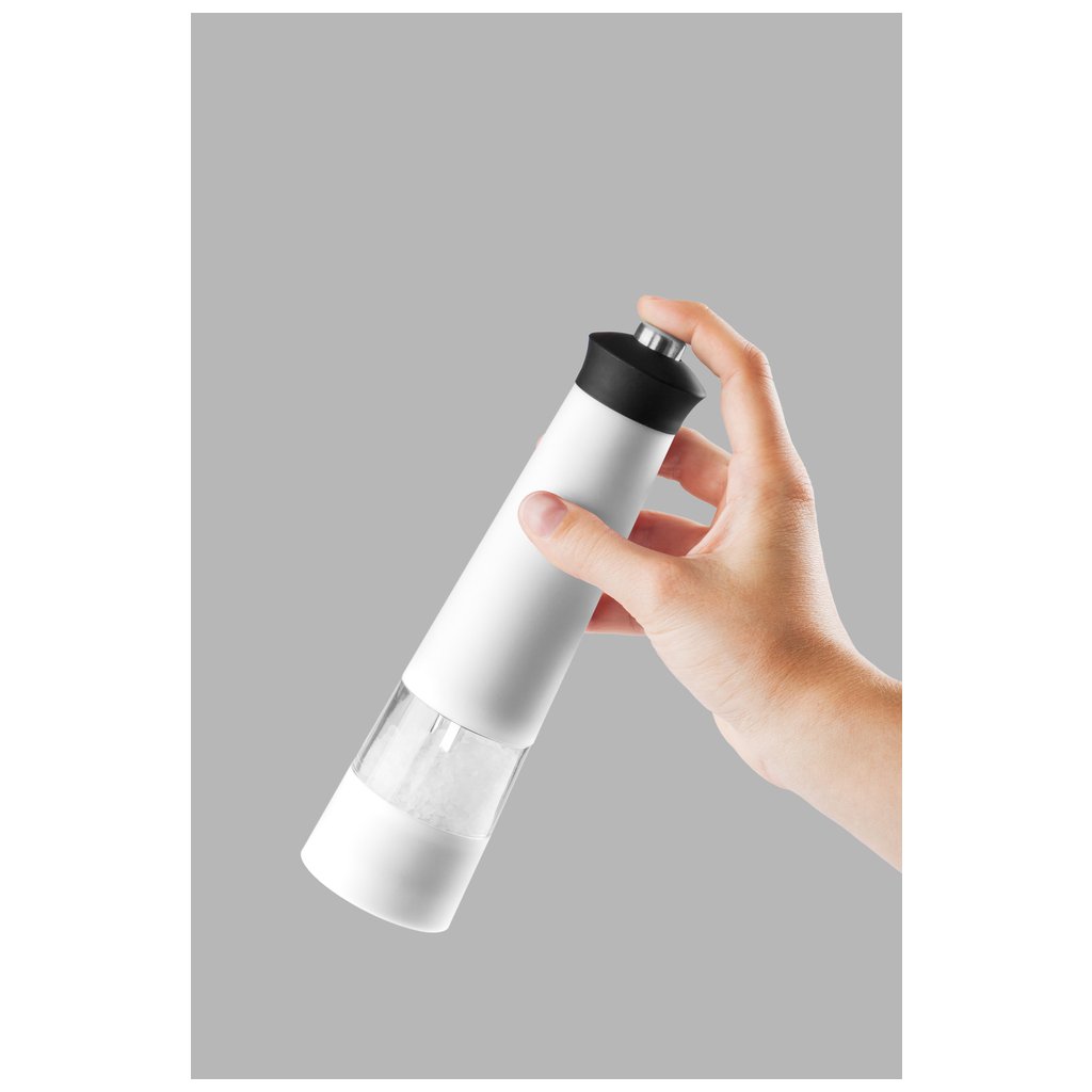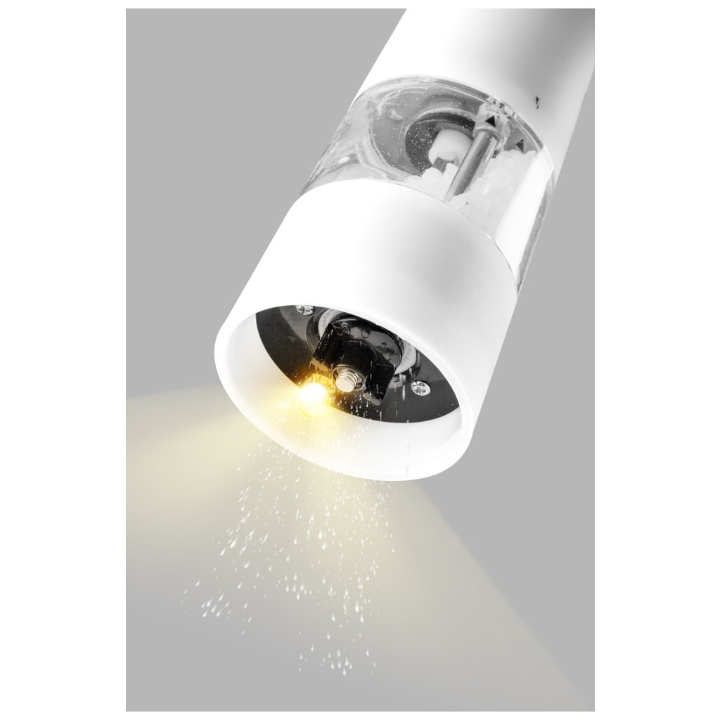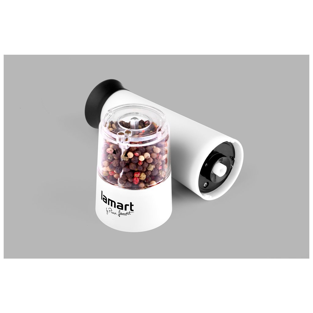 Elektrický mlynček značky Lamart je určený na celé korenie alebo soľ. Je vyrobený z jemného materiálu a keramický mechanizmus má nastaviteľnú hrubosť mletia. Priehľadný zásobník na korenie vám umožní sledovať množstvo korenia v mlynčeku, aby ste mohli včas dokúpiť nové. Ovládanie je veľmi jednoduché a intuitívne, stačí stlačiť a podržať tlačidlo na mlynčeku. Motor brúsky funguje na 4 batérie AAA, ktoré nie sú súčasťou balenia. Mlynček nesmie prísť do kontaktu s prúdom vody , a preto samozrejme nesmie ísť do umývačky riadu. Všetky časti mlynčeka umývajte len navlhčenou špongiou. UPOZORNENIE: Aby nedošlo k poškodeniu, neťahajte ovládač do krajných polôh na oboch stranách.
