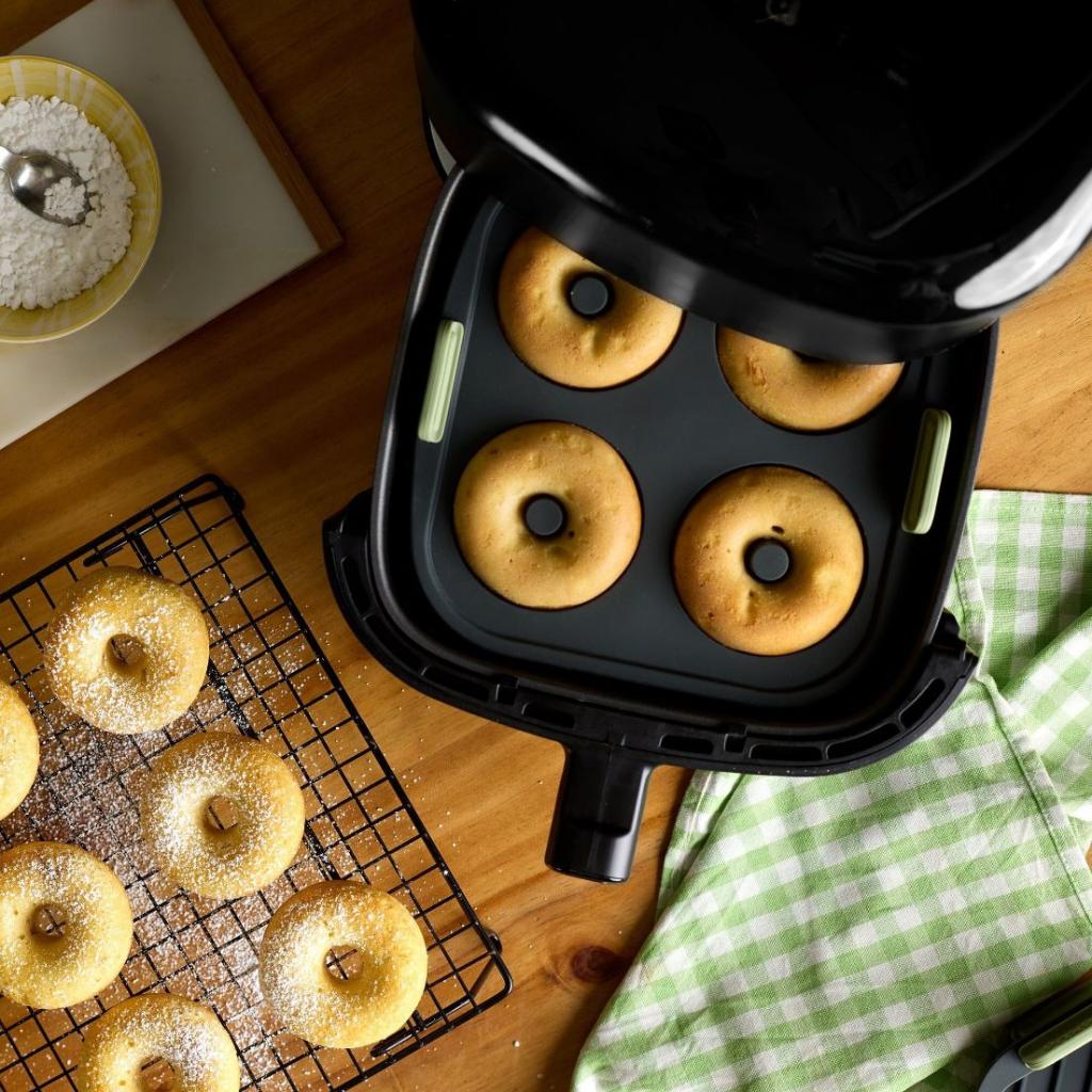 - Forma na šišky Lékué umožňuje ľahkú a rýchlu prípravu domácich donutov priamo v teplovzdušnej fritéze bez vyprážania v oleji.
