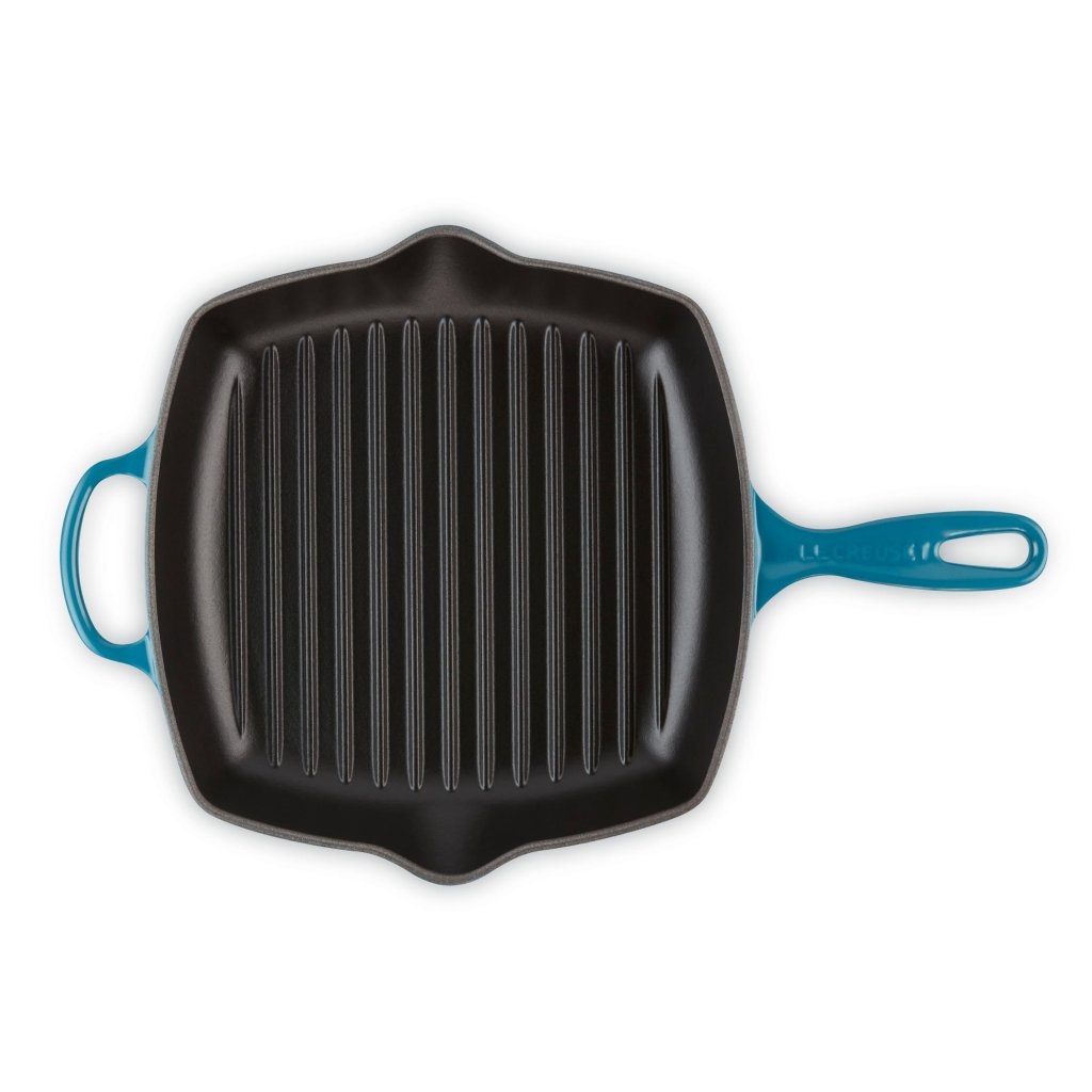 - Štvorcová liatinová grilovacia panvica Le Creuset vo farebnom prevedení DEEP TEAL je ideálna na rýchle zatiahnutie mäsa, rýb i zeleniny a uchovanie ich chuti i šťavnatosti.