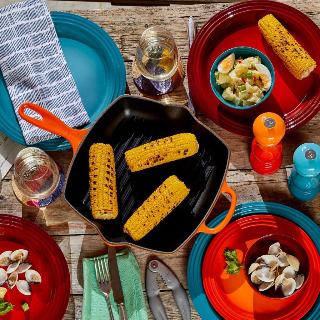 - Štvorcová liatinová grilovacia panvica Le Creuset vo farebnom prevedení FLAME je ideálna na rýchle zatiahnutie mäsa, rýb i zeleniny a uchovanie ich chuti i šťavnatosti.