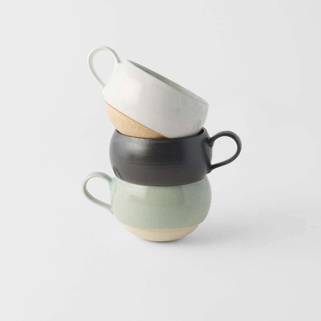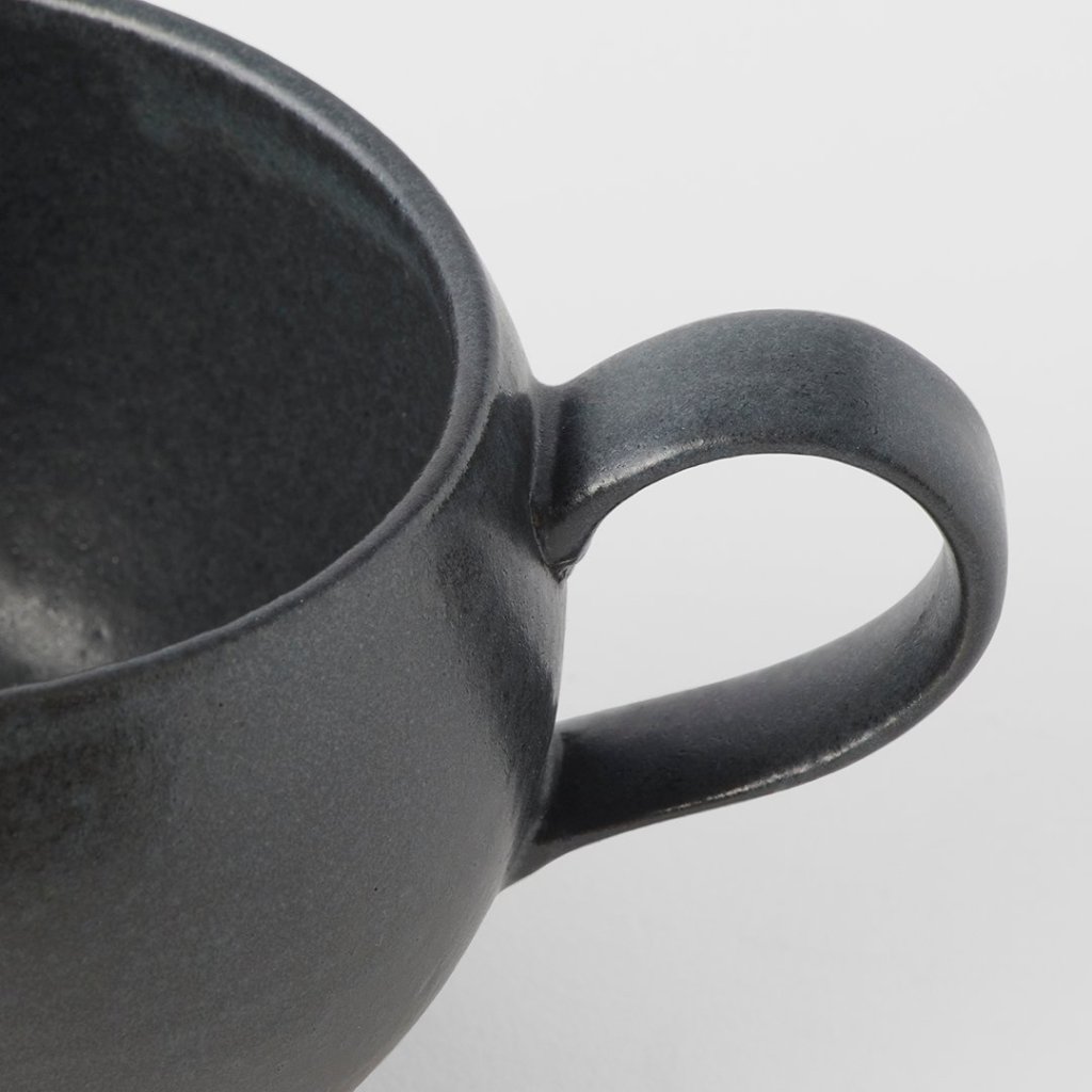 - široký čierny okrúhly hrnček s držadlom na rôzne teplé a studené nápoje