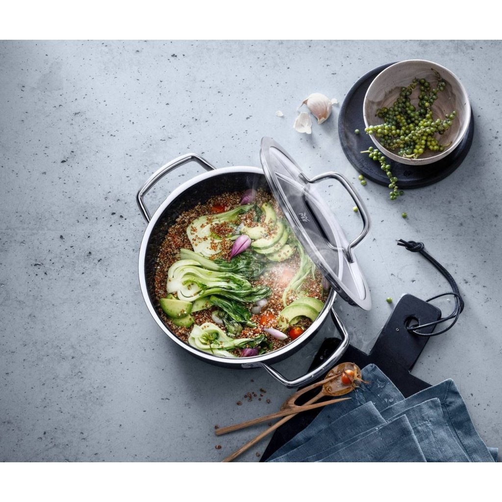 Riad FUSIONTEC nemeckej spoločnosti WMF je vybavený oceľovým jadrom, ktoré zabezpečuje optimálne vedenie a udržovanie tepla. Povrchový minerálny materiál zaisťuje komfort pri každodennom použití a jednoduchú údržbu. Sklenená pokrievka zo žiaruvzdorného skla je vhodná na zapekanie v rúre až do 180 °C.
