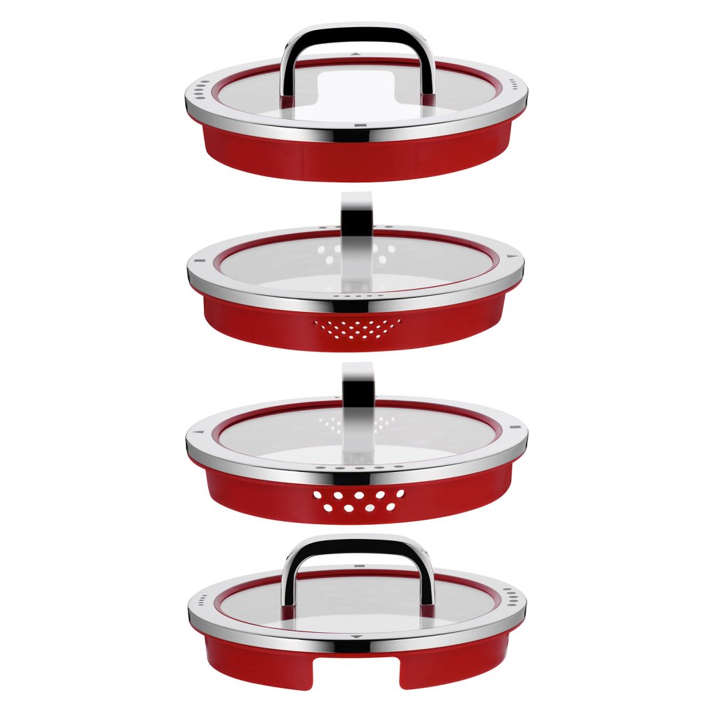 Návrhári NOA Design vybavili hrnce Function 4 jedinečnými pokrievkami. Tieto robustné sklenené pokrievky s držadlami z nehrdzavejúcej ocele umožňujú dostatočne veľkú a dobrú kontrolu obsahu hrncov – a navyše aj silikónovým prstencom na tlmenie nárazov. Ich pridanou hodnotou je funkcia kontrolovaného zlievania bez použitia cedidla, ktorá ušetrí čas a tiež riad. Symboly vyznačené navrchu pokrievky napovedajú, ako treba pokrievky umiestniť pri varení s malým množstvom vody, pri zlievaní zemiakov, cestovín, ryže či pri rýchlom vyliatí obsahu.