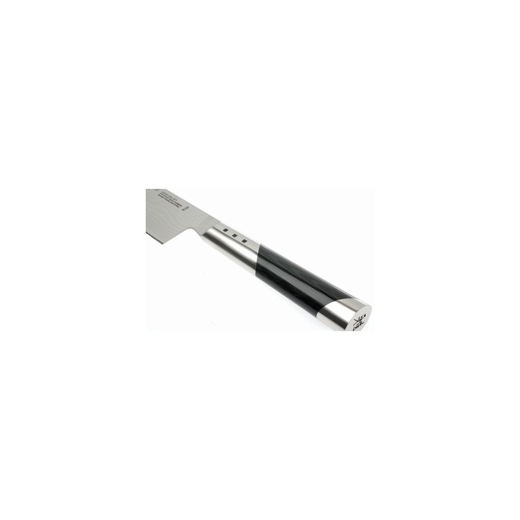 Jadro noža je vyrobené z CMV60 ocele vysokej tvrdosti obsahujúcej kobalt, molybdén a vanád. Kvôli dosiahnutiu ešte lepších vlastností ocele bolo použité unikátne kalenie postupom CRYODUR®, počas ktorého je zmrazená pri -196 ° C. Výsledný materiál sa môže pochváliť výnimočnou tvrdosťou. Damascénsky vzhľad tvorí ďalších 64 vrstiev nehrdzavejúcej ocele dvoch rôznych tvrdostí, vzor na každom noži je neopakovateľný. Tradičné ručné ostrenie Honbazuke je overené stovkami rokov práce nožiarskych majstrov. Ide o viacfázový proces brúsenia, pri ktorom je nôž najprv brúsený pomocou vertikálneho a horizontálneho rotujúceho brúsneho kameňa a finálne je ostrie doleštené koženým honovacím remeňom.Symetrický výbrus a ostrie Katana Edge zaručujú ľahký prienik surovinami. Vykrojená záštita bráni zošmyknutiu prstov na ostrie.