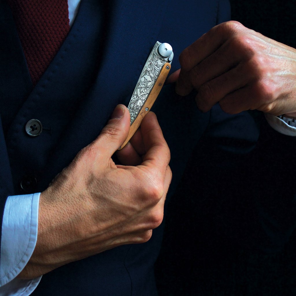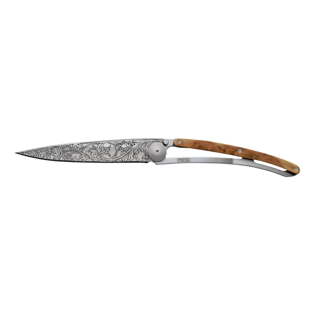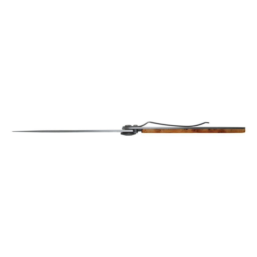 Ultraľahký vreckový nôž z ušľachtilej ocele s matným povrchom, je vybavený bezpečnostnou poistkou liner lock, ktorá zaisťuje bezpečnú manipuláciu aj uloženie noža.Laserové gravírovanie čepele je odolné rovnako ako tetovanie.Drevená črienka z koreňa odolného borievkového dreva je pevne usadená na rukoväti noža. Francúzska borievka má dlhotrvajúcu jemnú aromatickú vôňu jemného korenia, ktorá pridáva noži charizmu.