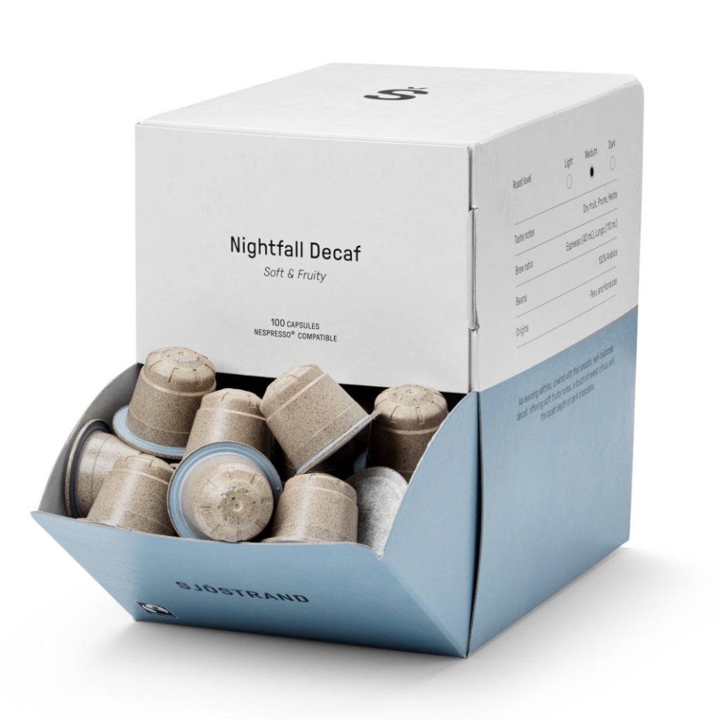 - Kávové kapsule Sjöstrand NIGHTFALL DECAF sú perfektnou voľbou pre milovníkov kávy, ktorí sa večer nechcú vzdať šálky bez obáv z kofeínu.