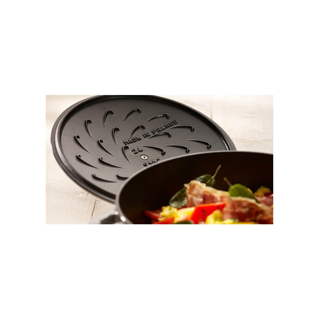 Kastról na soté s liatinovou "samopodlievacou" pokrievkou Chistera zaistí, že čokoľvek v ňom varíte, je lahodné a delikátne. "Chistera Drop-Structure” na spodnej strane pokrievky napomáha priebežnej cirkulácii vody v hrnci a vytvára tak ideálne podmienky na pomalé varenie a dusenie. Varenie v riade Staub je veľmi jednoduché nielen vďaka overenému tvaru riadu, ale taktiež vďaka použitému materiálu.
