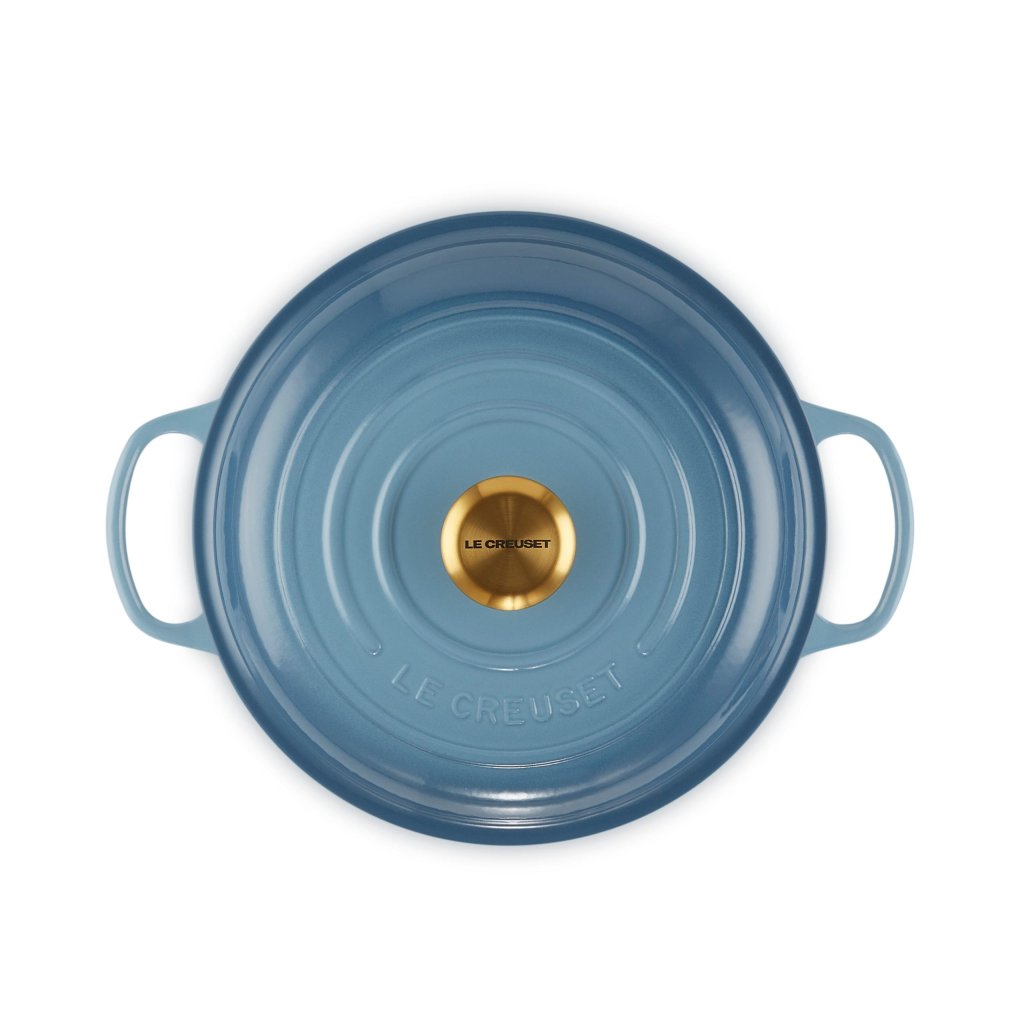- Elegantný svetlo modrý odtieň CHAMBRAY so zlatým úchytom dodáva kastrólu jemný a štýlový vzhľad, ktorý sa stane ozdobou vašej kuchyne aj stola.