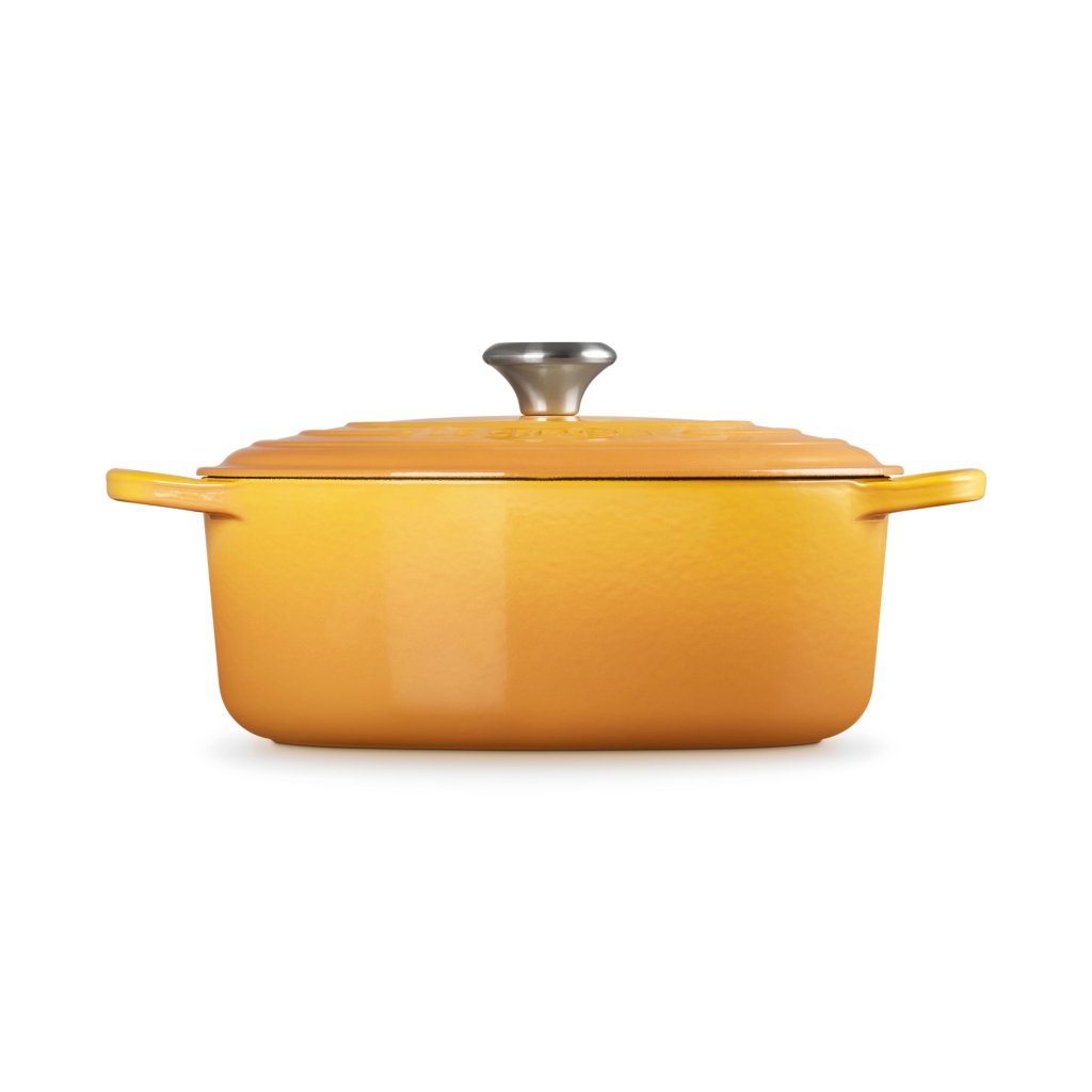 - Oválny liatinový kastról Le Creuset vo farebnom prevedení NECTAR je univerzálnym pomocníkom v kuchyni, ktorý je dostatočne priestranný na upečenie celého jahňacieho stehna a zároveň úzky, aby v rúre zostalo miesto aj na prílohy.