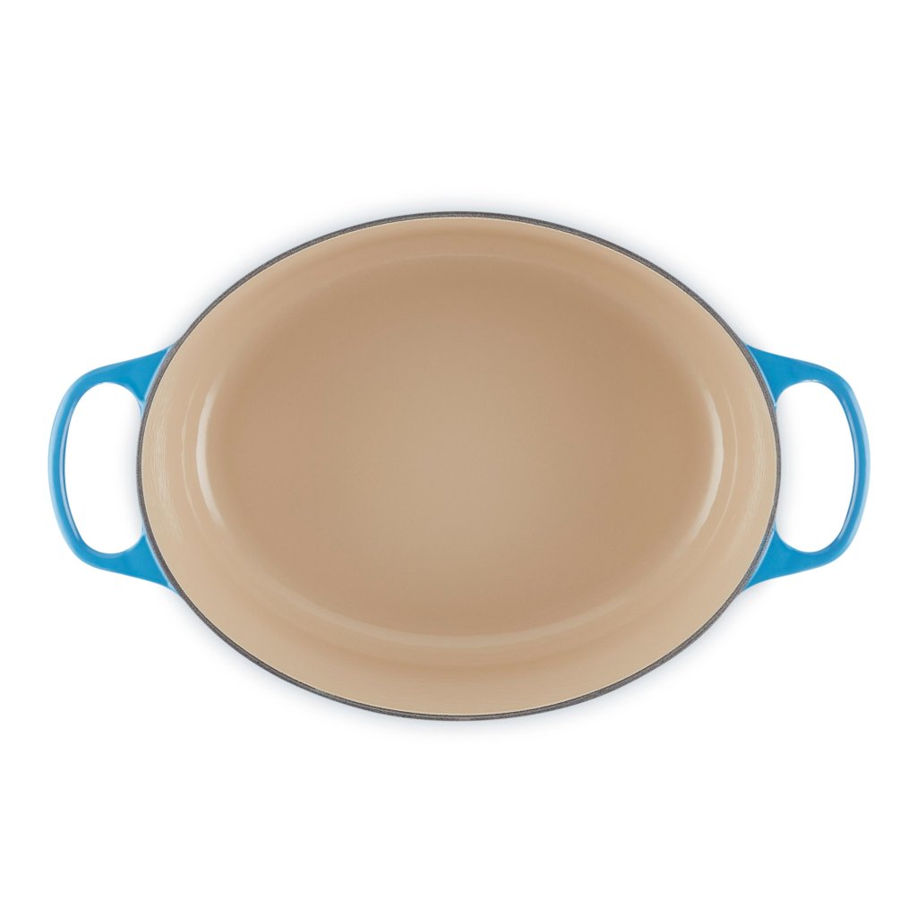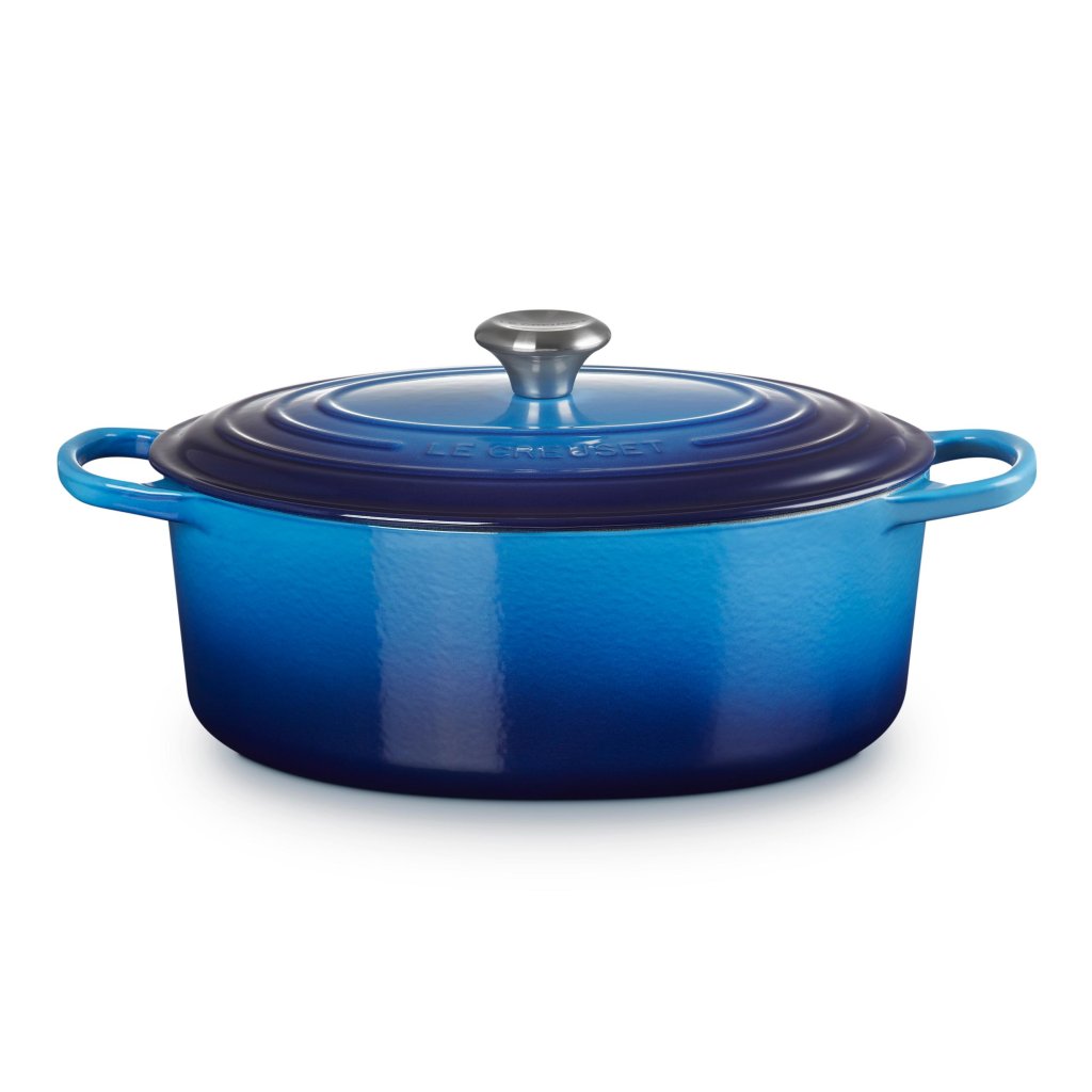 - Oválny liatinový kastról Le Creuset vo farebnom prevedení AZURE je univerzálnym pomocníkom v kuchyni, ktorý je dostatočne priestranný na upečenie celého jahňacieho stehna a zároveň úzky, aby v rúre zostalo miesto aj na prílohy.