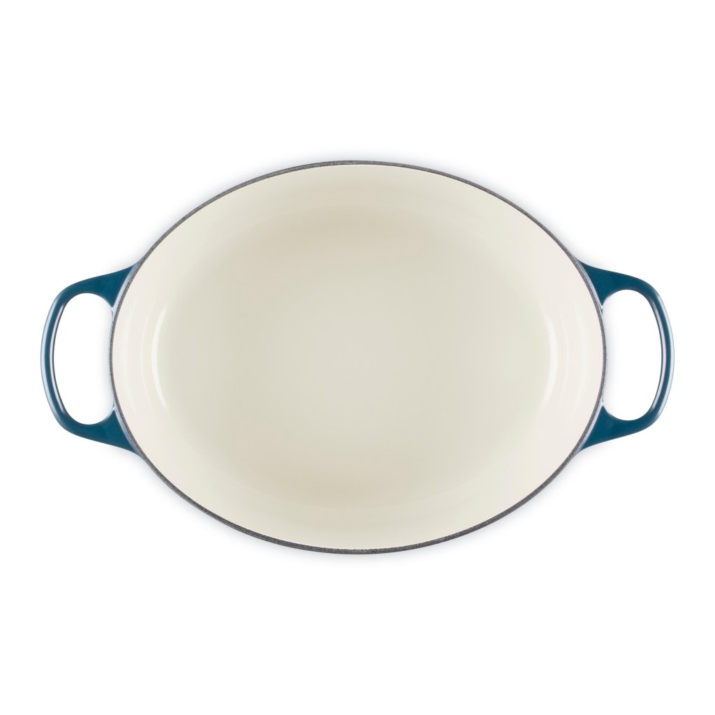 - Oválny liatinový kastról Le Creuset vo farebnom prevedení NUIT je univerzálnym pomocníkom v kuchyni, ktorý je dostatočne priestranný na upečenie celého jahňacieho stehna a zároveň úzky, aby v rúre zostalo miesto aj na prílohy.