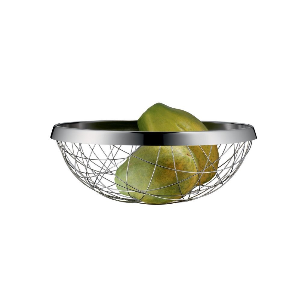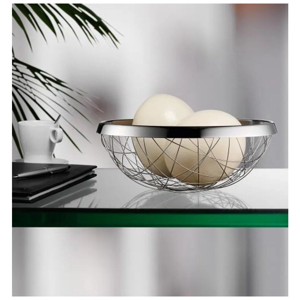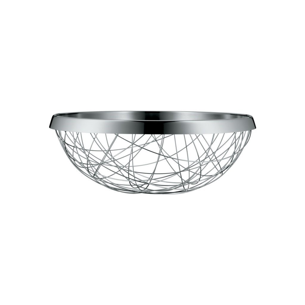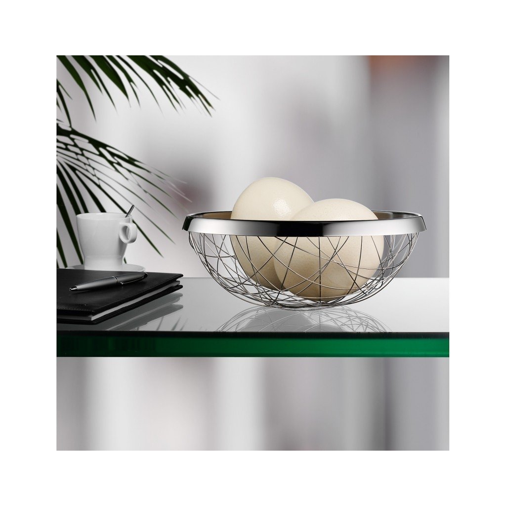 Atraktívny drôtený košík s 27 ohýbanými drôtmi; ručná práca so stabilným sedením na stole. Horný lem košíka je z matnej nehrdzavejúcej ocele, drôty sú leštené.