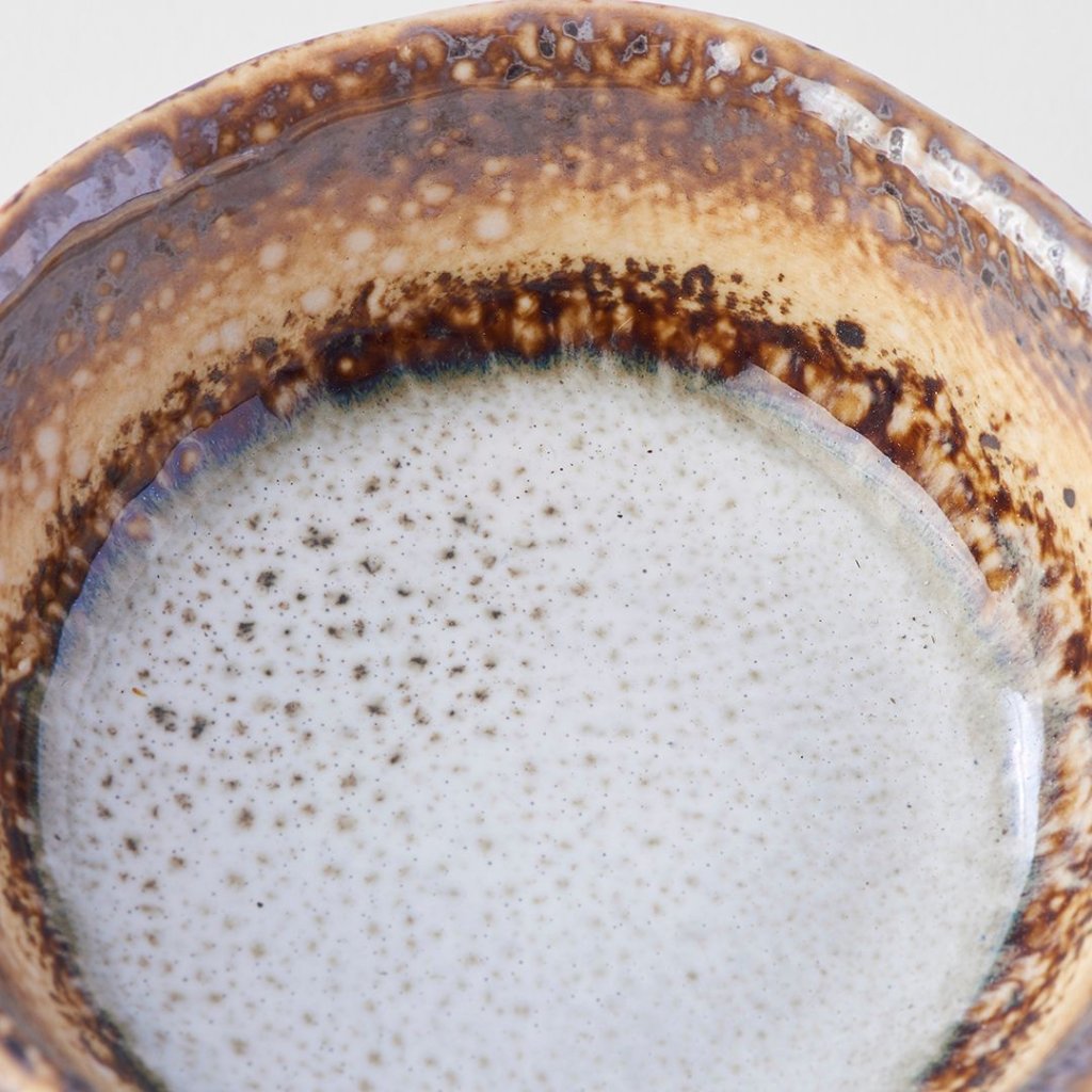 Miska na omáčku s nepravidelným okrajom z kolekce Akane Grey, o priemere 8 cm. Lesklá miska s popraskanu glazúrou má šedú farbu, žlté línie a hnedé okraje.