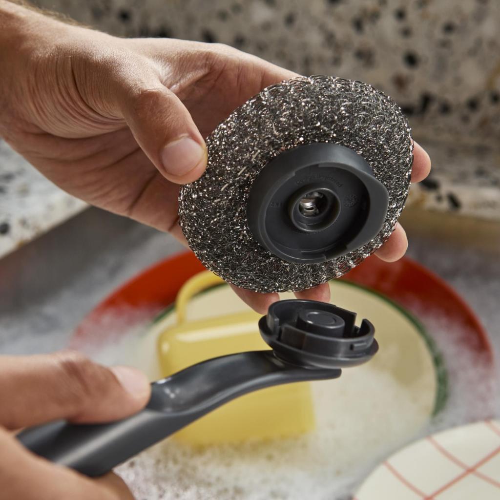 - Konštrukcia z nehrdzavejúcej ocele poskytuje vysokú abrazívnu účinnosť pri odstraňovaní pripálených zvyškov jedla.