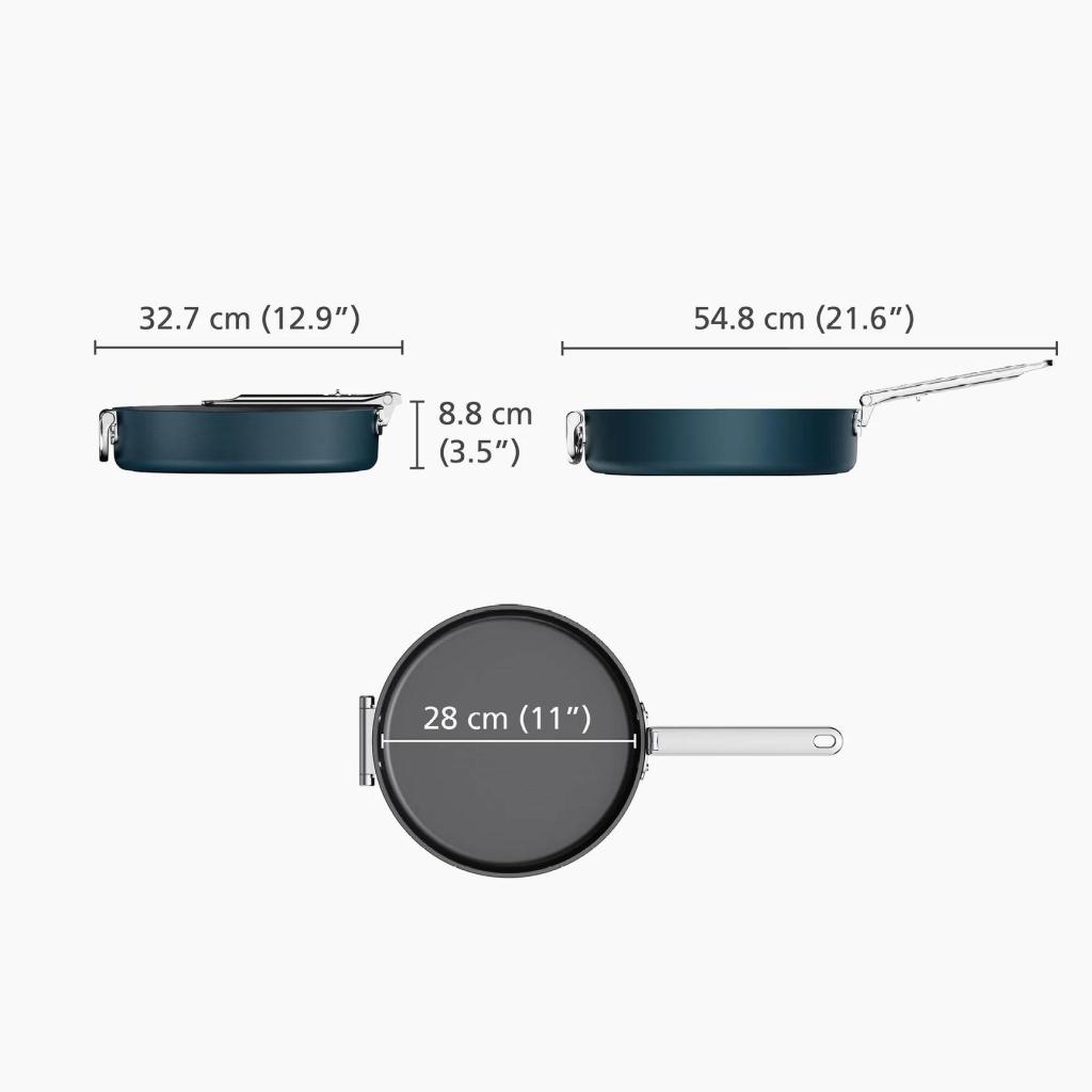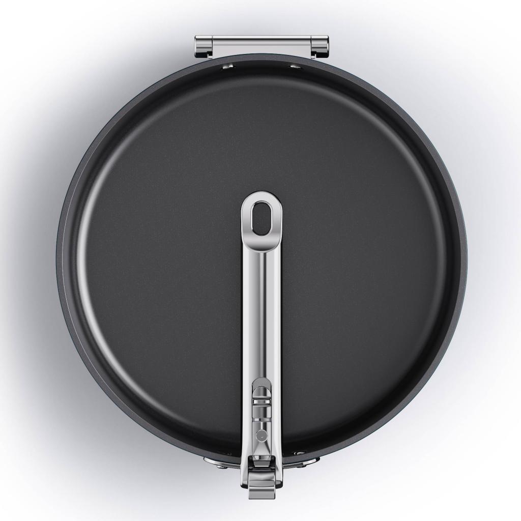 - Vďaka skladaciemu mechanizmu možno panvicu ľahko stohovať s ďalšími kusmi riadu, čo výrazne uľahčuje prehľadné usporiadanie kuchynských skriniek.