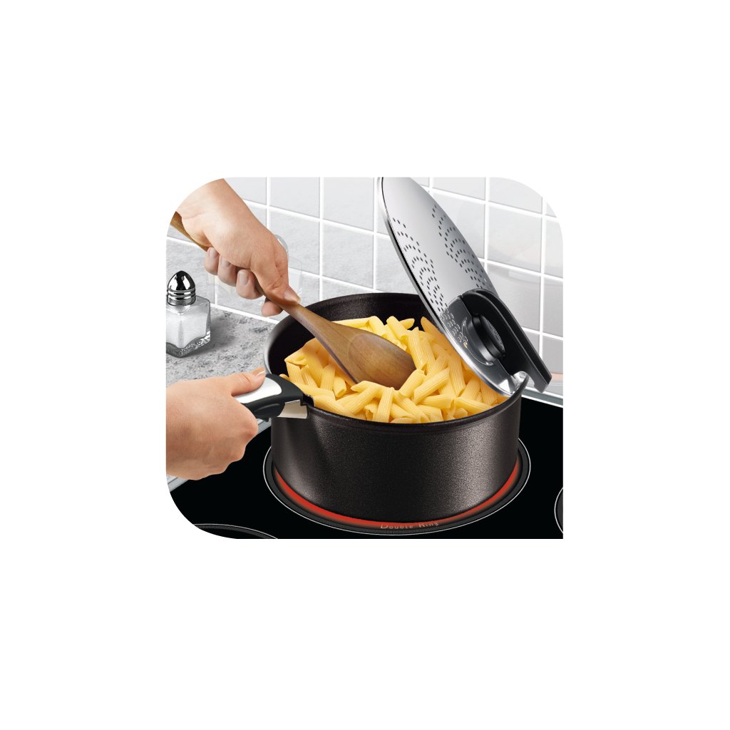 Vysoko kvalitná svetoznáma značka Tefal teraz prichádza s kolekciami šikovného riadu Tefal Ingenio, ktoré sa nezaobíde bez praktickej pokrievka na hrniec na cedenie. Môžete si vybrať napríklad túto pokrievku z nehrdzavejúcej ocele, ktorá je kompatibilná so všetkými hrncami s priemerom 14, 16, 18 a 20 cm z týchto radov.