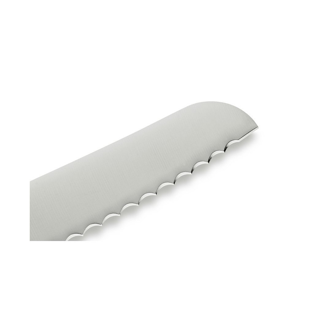 Vrúbkované ostrie noža na chlieb a pečivo Samura Bamboo je ideálna pre potraviny s tvrdou kôrkou alebo šupkou a mäkkým vnútrom. Je vhodný na krájanie pečiva na plátky, rovnako tak sa skvele hodí na krájanie ovocia – napr. citrusových plodov a ananásu. Ostrá vrúbkovaná čepeľ jemne rozreže mäkké alebo šťavnaté jadro bez toho, aby sa plod rozpadol. Čepeľ dlhá 20 cm je ideálna na spracovanie produktov akejkoľvek veľkosti. Neobvyklý tvar kovovej rukoväte dodáva nožu mimoriadne štýlový vzhľad.
