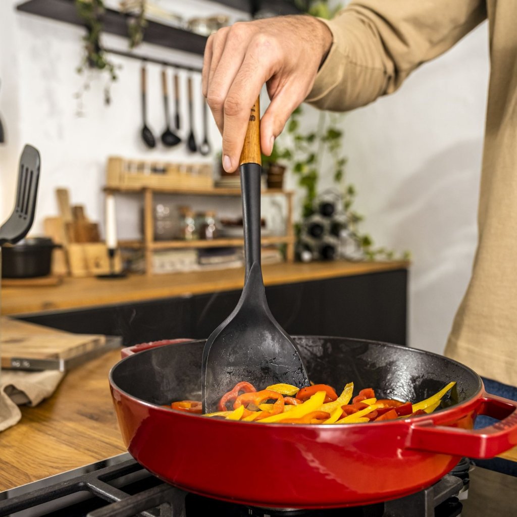 - pracovná časť z čierneho matného silikónu je dokonale kompatibilná s liatinovým riadom Staub