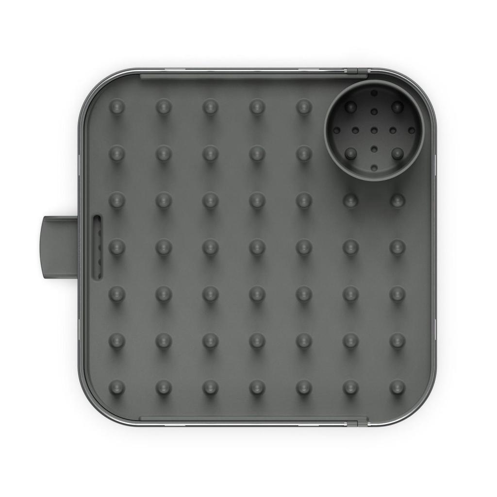 - Integrovaná hubička efektívne odvádza odkvapkávajúcu vodu priamo do drezu a pomáha udržiavať pracovnú dosku suchú aj pri väčšom zaťažení riadom.