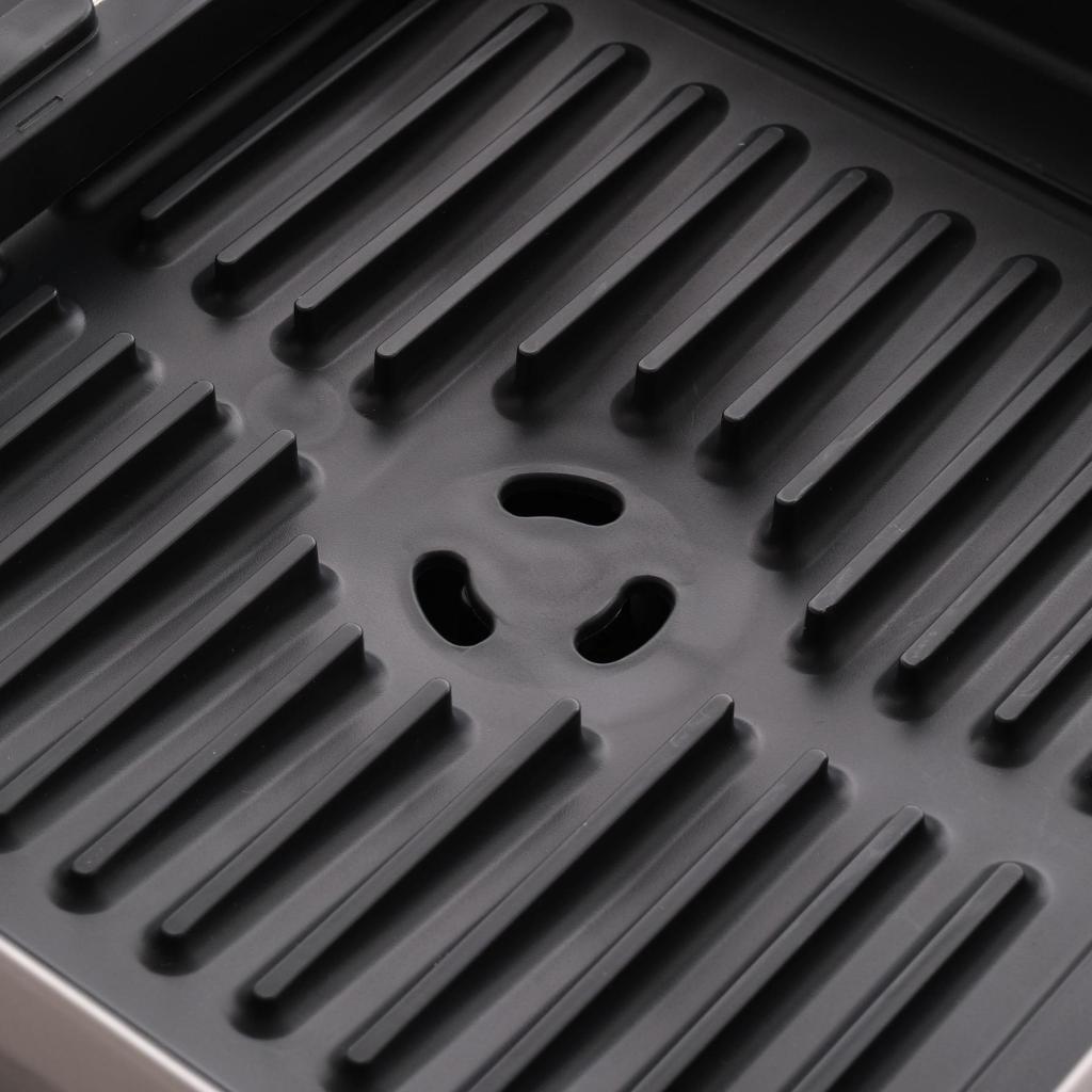 - Drážkovaná plocha podporuje rýchlejší odtok vody a pomáha udržať riad počas sušenia stabilný.