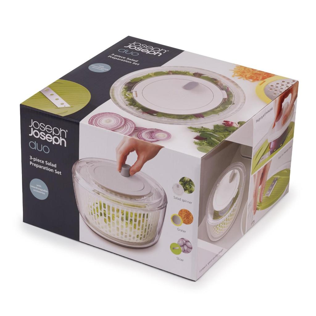 - Šalátová súprava Joseph Joseph DUO je univerzálny pomocník pre rýchlu a pohodlnú prípravu čerstvých šalátov aj zeleninových príloh v každodennej kuchyni.