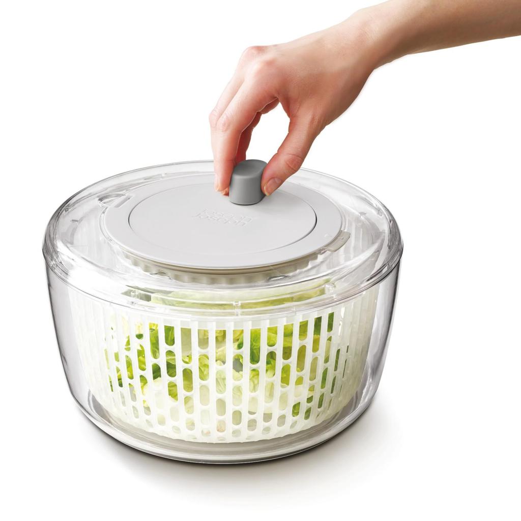 - Základom je rotačná odstredivka, ktorá po opláchnutí šetrne a efektívne vysuší listy šalátu, aby zostali chrumkavé a pripravené na okamžité servírovanie.