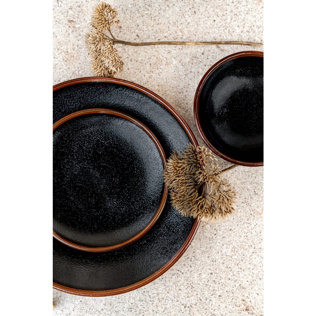 Tanier má čiernu farbu a zrnitý povrch. Okraj taniera je ohraničený hnedou farbou.