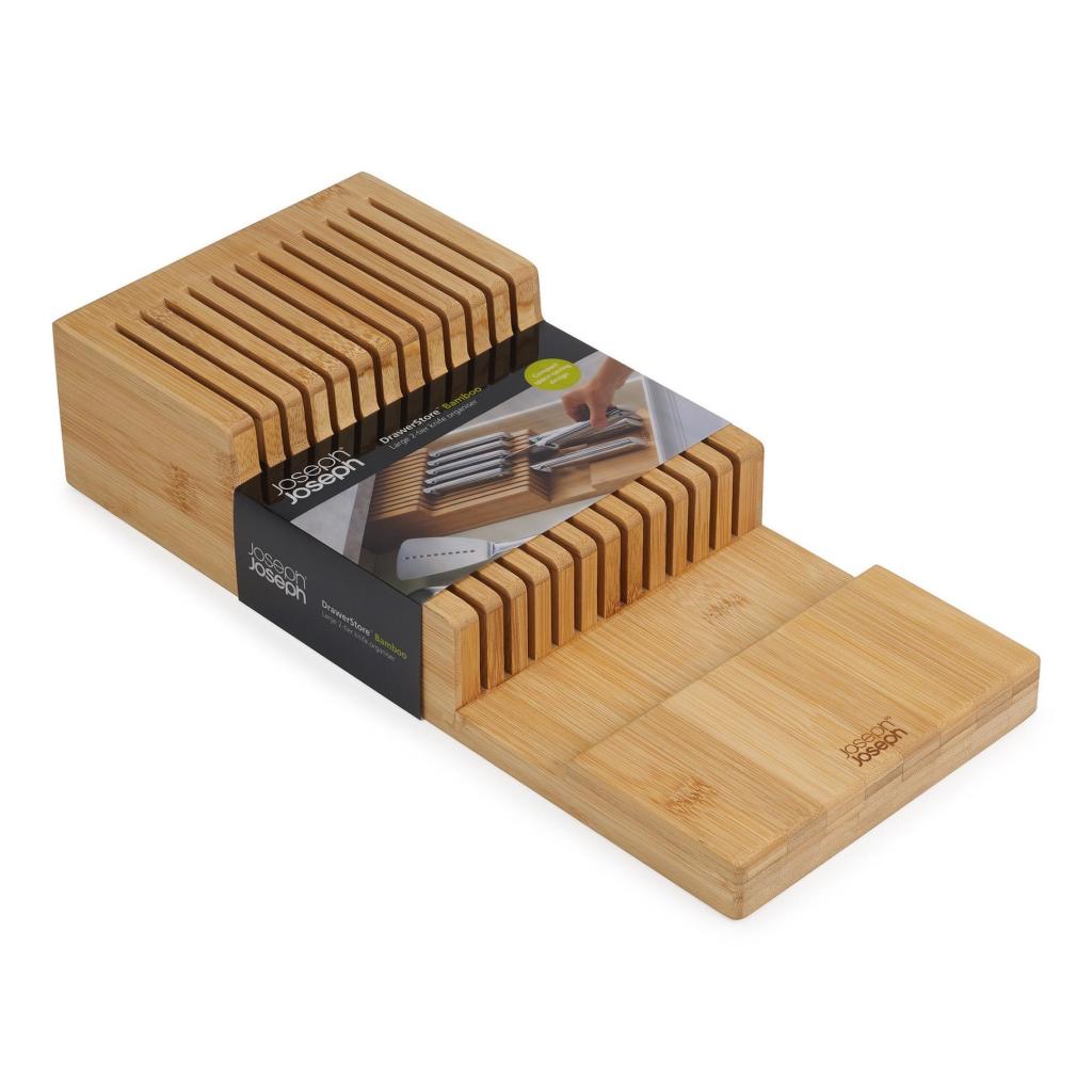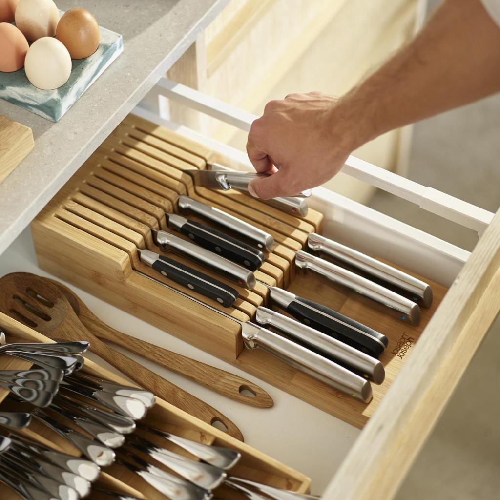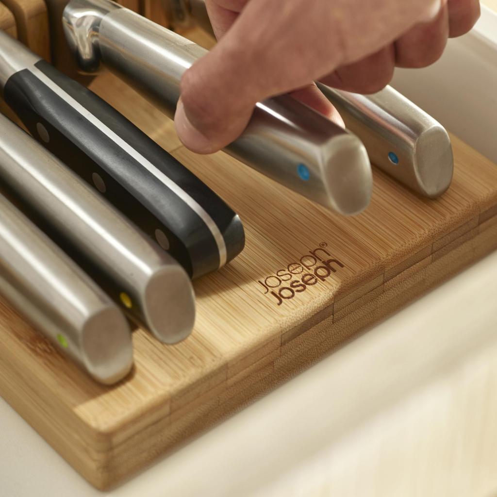 - Organizér na nože Joseph Joseph DRAWERSTORE z bambusu umožňuje bezpečne a prehľadne uložiť kuchynské nože priamo do zásuvky.