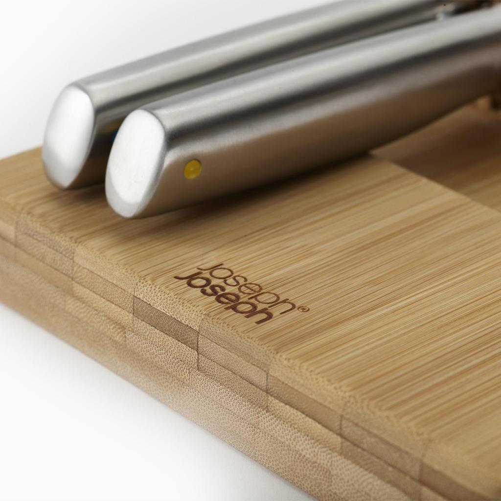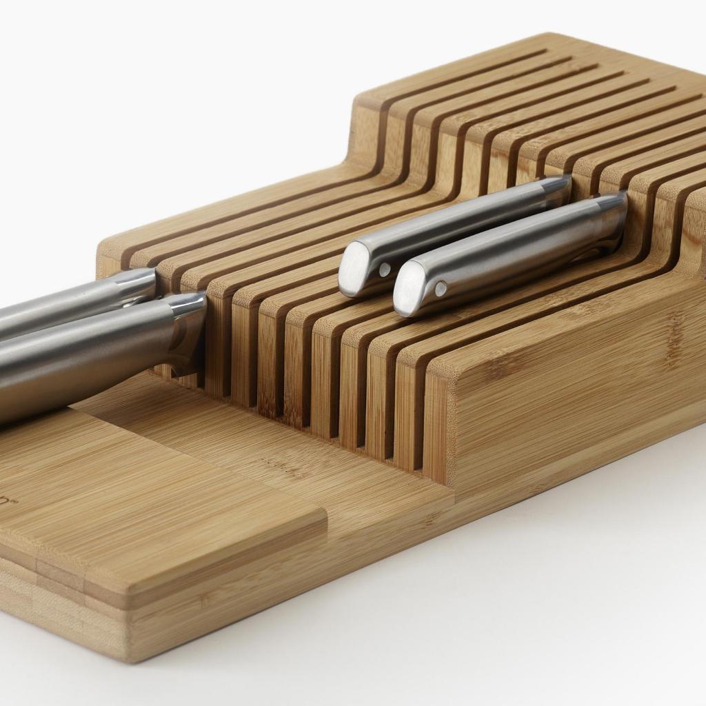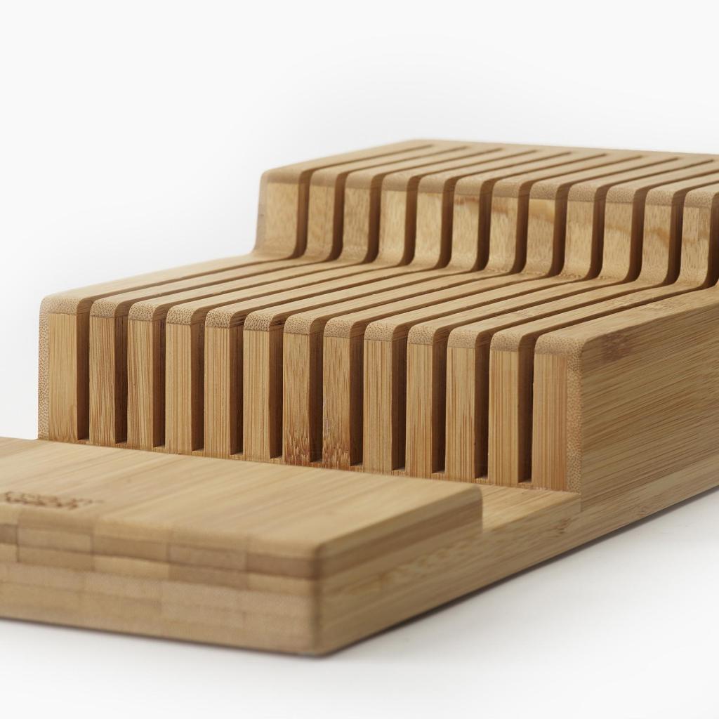 - Organizér na nože Joseph Joseph DRAWERSTORE z bambusu umožňuje bezpečne a prehľadne uložiť kuchynské nože priamo do zásuvky.