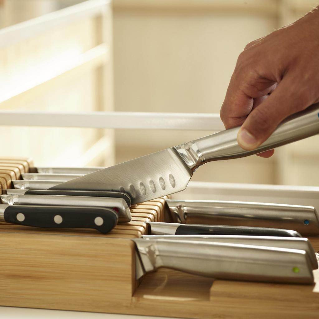 - Uloženie nožov v zásuvke pomáha udržať pracovnú dosku čistú a vytvára viac priestoru na kuchynskej linke.