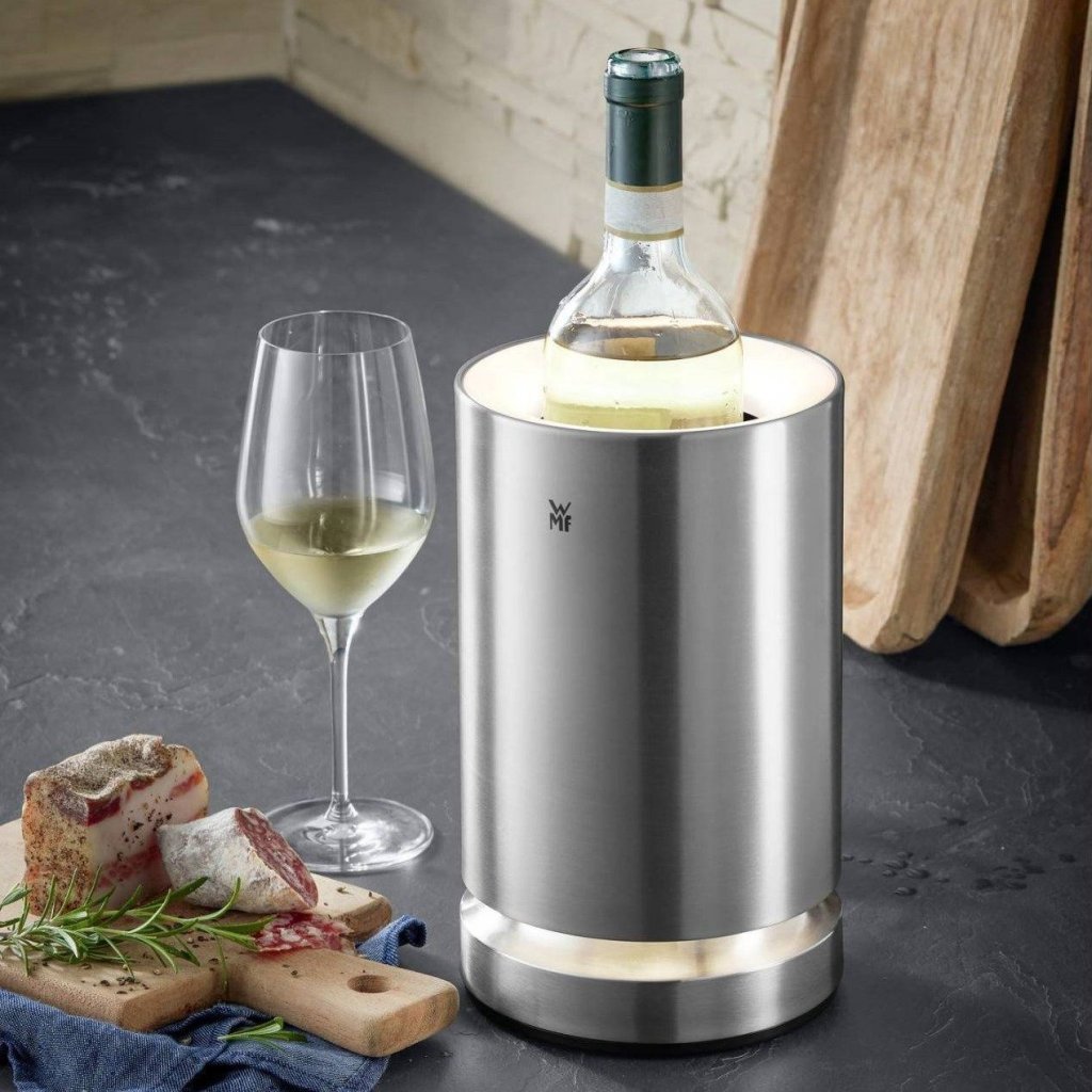 Chladiaca nádoba na šampanské a víno Ambiente od značky WMF bola vyrobená z brúsenej nehrdzavejúcej ocele Cromargan®. Vďaka chladiacej batérii si môžete vychutnávať šampanské alebo biele víno dokonale vychladnuté až 4 – 5 hodín. Presne taká je totiž výdrž batérie. Okrem chladenia vám tento spotrebič poskytne aj dokonalú atmosféru. Súčasťou je LED osvetlenie s 3 stupňami intenzity. Ovládanie osvetlenia iba jemným dotykom na stenu nádoby.