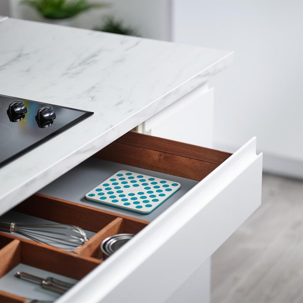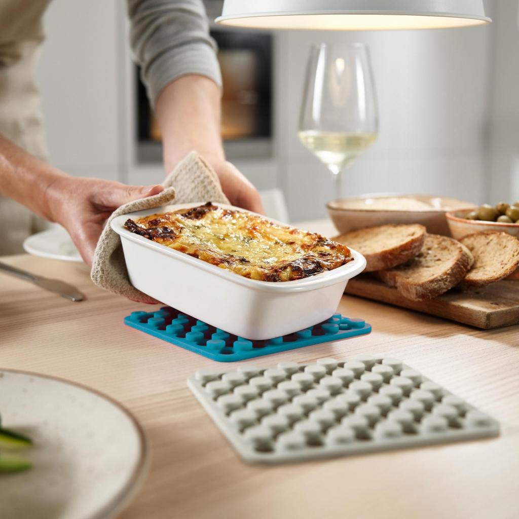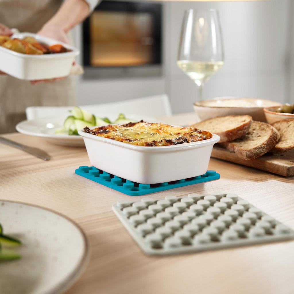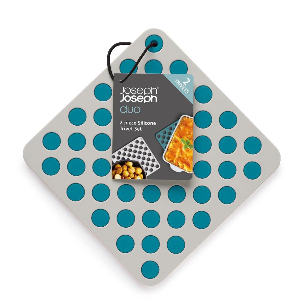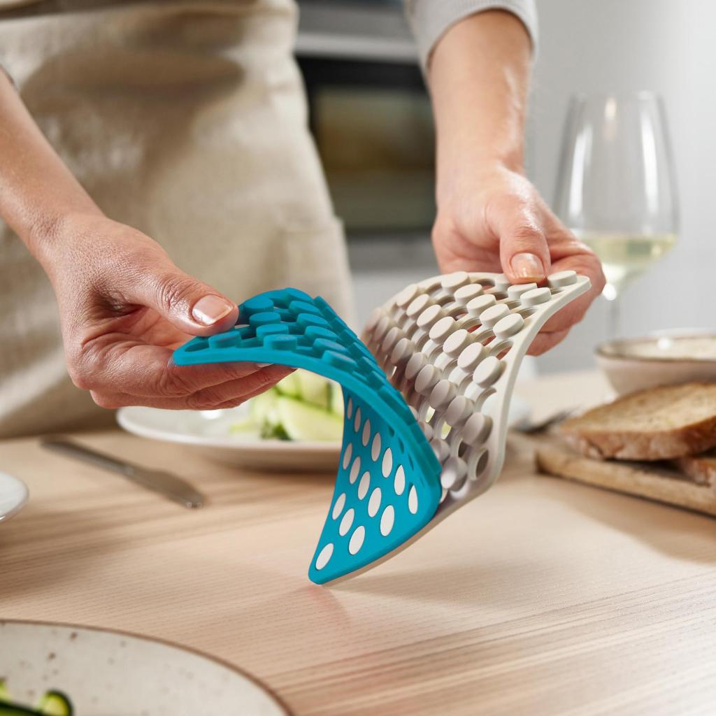 - Silikónové podložky pod horúce nádoby Joseph Joseph DUO OPAL spoľahlivo chránia kuchynskú pracovnú dosku aj jedálenský stôl pred vysokými teplotami a poškodením.