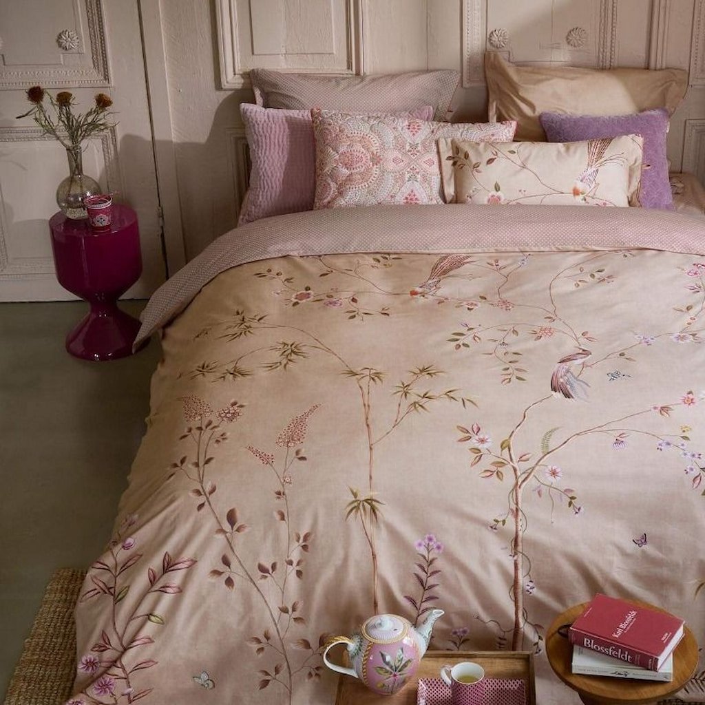 - dizajn posteľnej bielizne zdobia jemné motívy kvetov, bambusových výhonkov a vtákov na jemnom pieskovom pozadí
