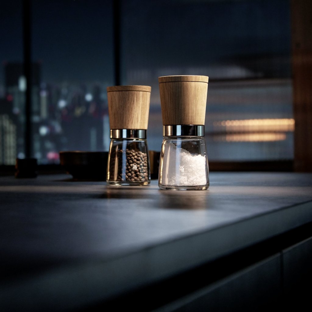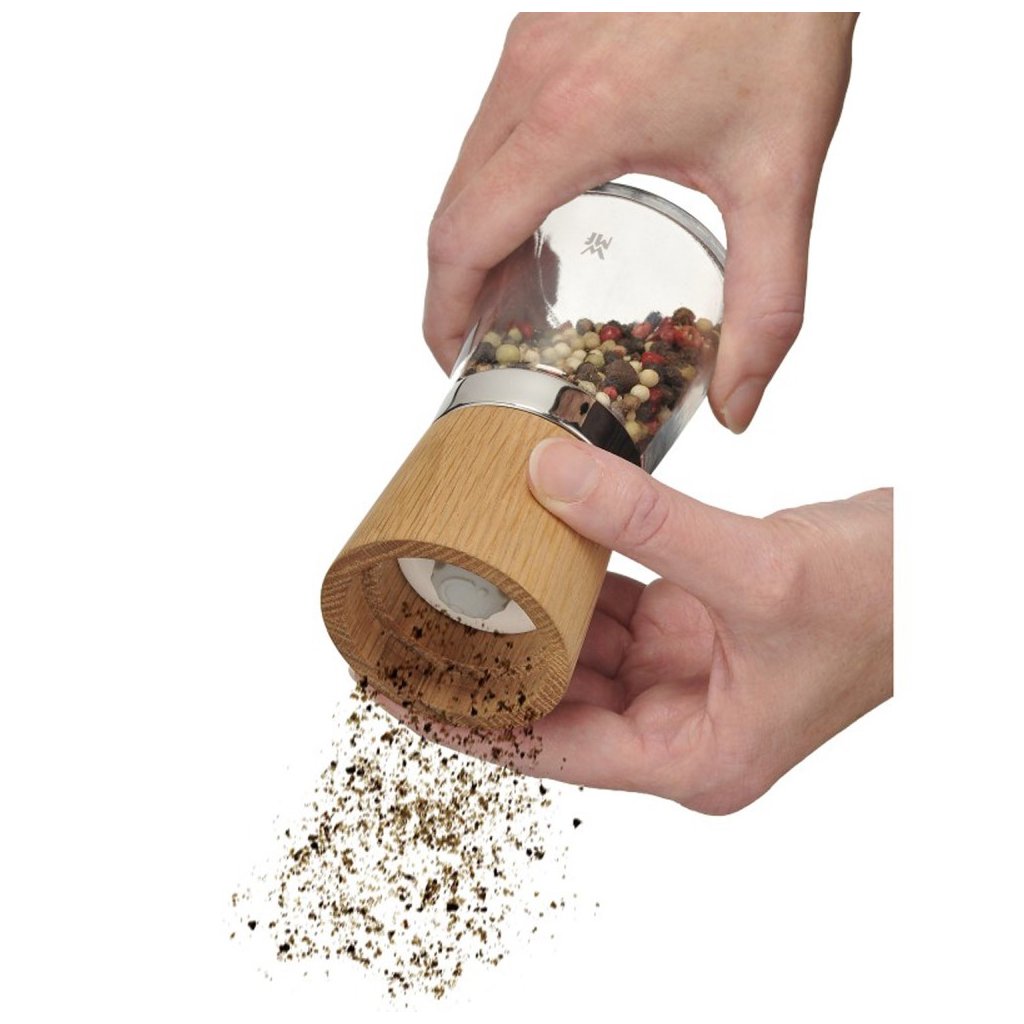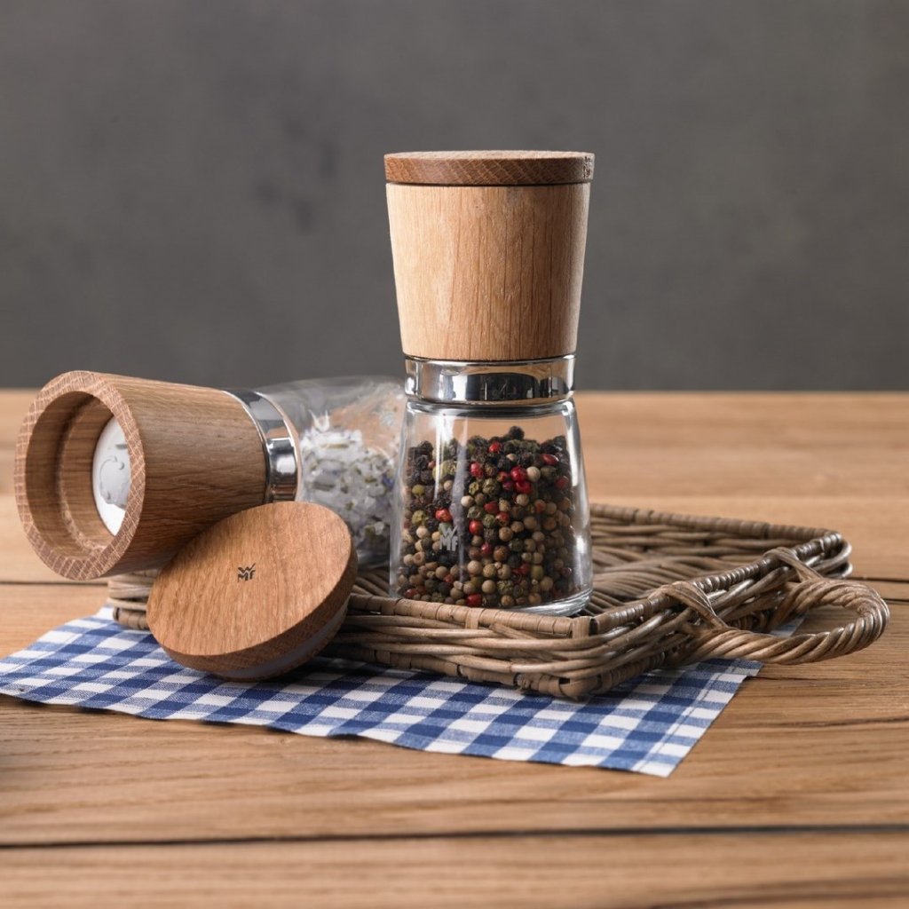 Mlynčeky na korenie Ceramill® Nature od nemeckej spoločnosti WMF v jednoduchom a elegantnom dizajne sú vyrobené z dubového dreva, WMF skla a nehrdzavejúcej ocele 18/10 Cromargan®. Použité drevo je krásne na pohľad a príjemné na dotyk. V kombinácii s priehľadným sklom nádobky a prvkom z nehrdzavejúcej ocele získávame dizajn zodpovedajúci súčasnému trendu prirodzenosti.