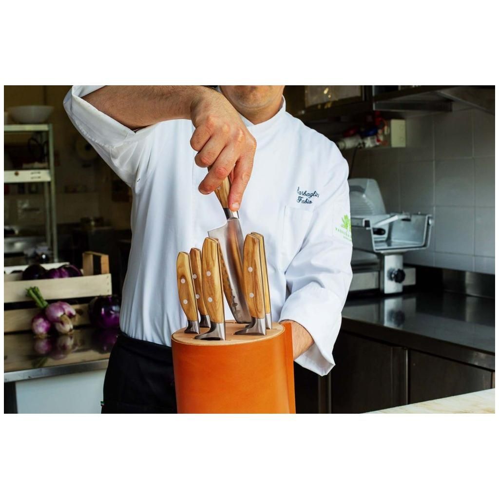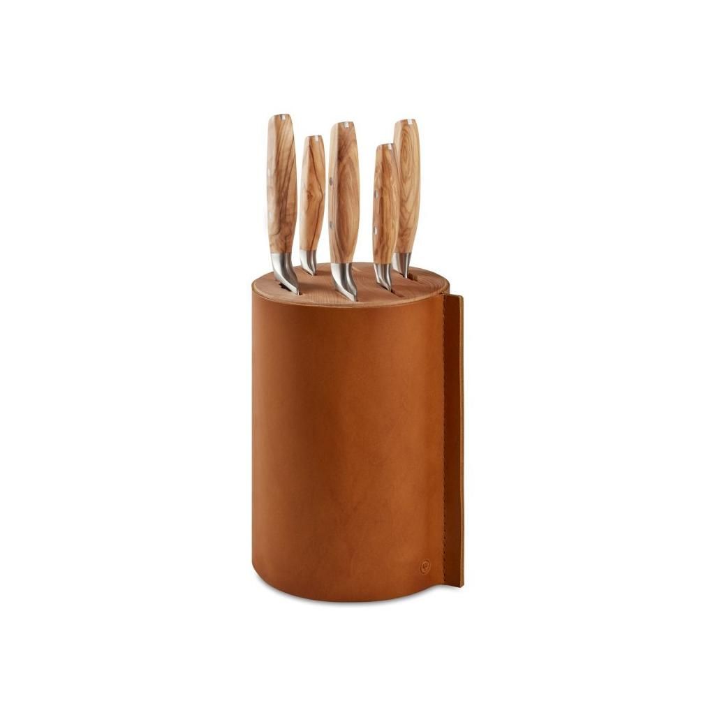 - odolný a veľmi stabilný dizajnový blok na 6 nožov z bukového dreva obaleného prírodnou kožou