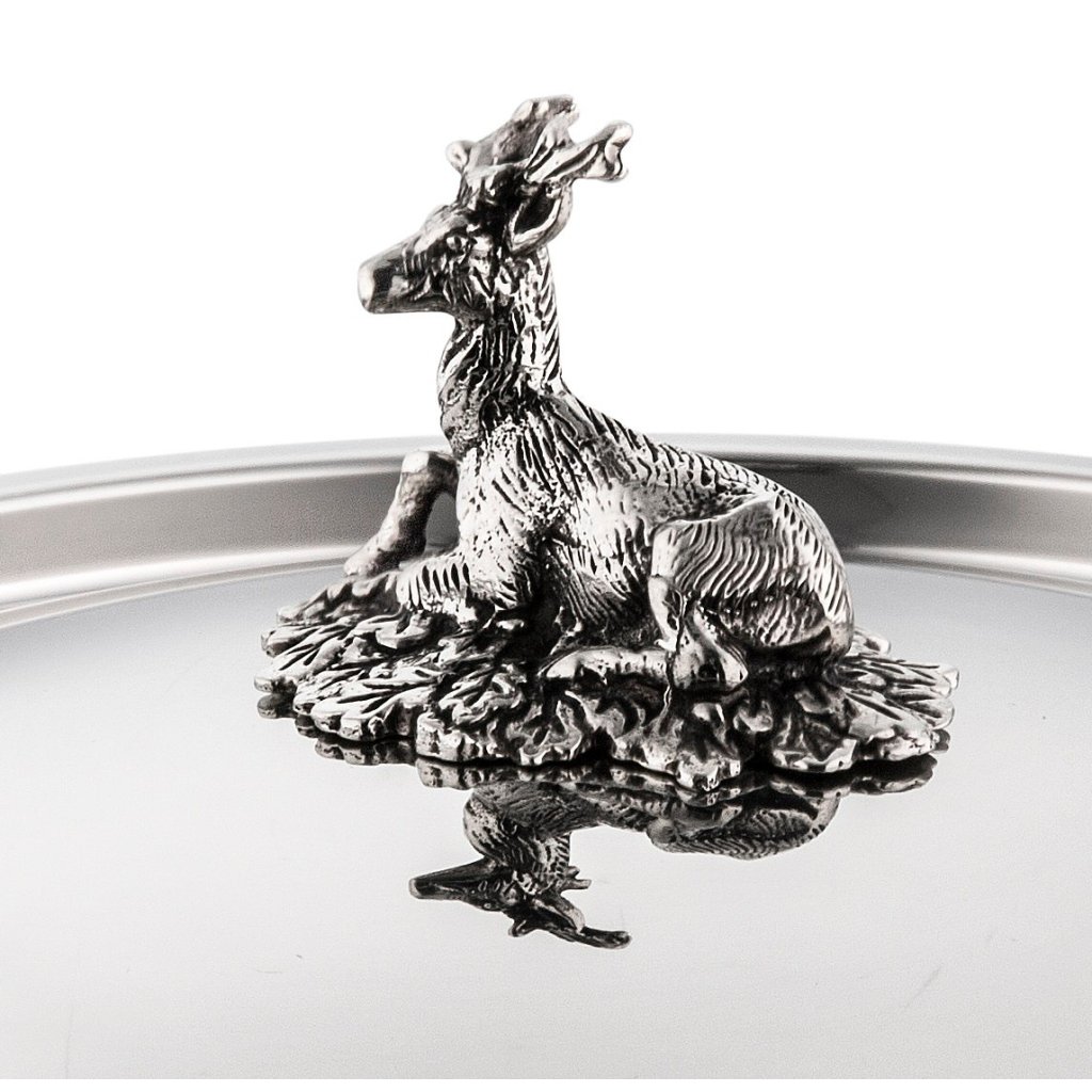 - masívna nehrdzavejúca oceľ pokrievka na hrniec s rukoväťou s krásnym dekorom, ktorá je ručne odliata z masívneho bronzu a postriebrená