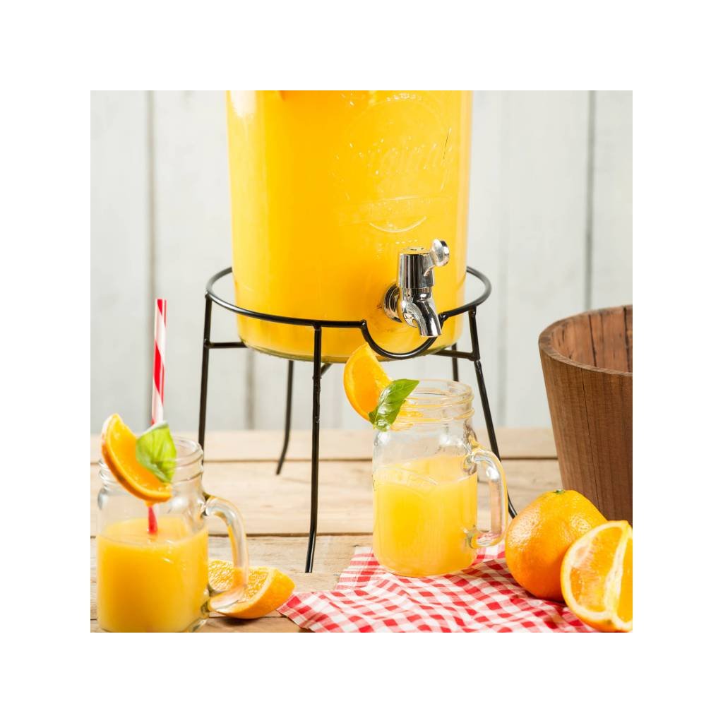 Stojan na sklenený súdok s kohútikom od výrobcu Kilner má robustnú kovovú konštrukciu s piatimi pevnými nohami, čo zaisťuje stabilitu. Výška stojanu je 48,5 cm a priemer 21 cm. Vďaka stojanu už nemusíte dávať sklenený súdok s kohútikom na hranu stola, ale kamkoľvek potrebujete. Stojan je tiež dostatočne vysoký a tak sa nemusíte obmedzovať vo veľkosti pohára, do ktorých čapujete nápoj zo súdka. Stojan je vhodný pre všetky veľkosti sklenených súdkov s kohútikom od výrobcu Kilner.