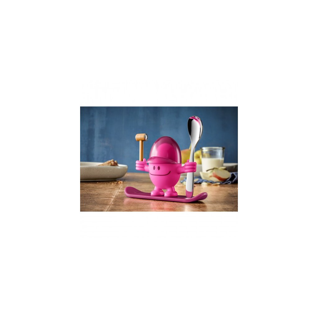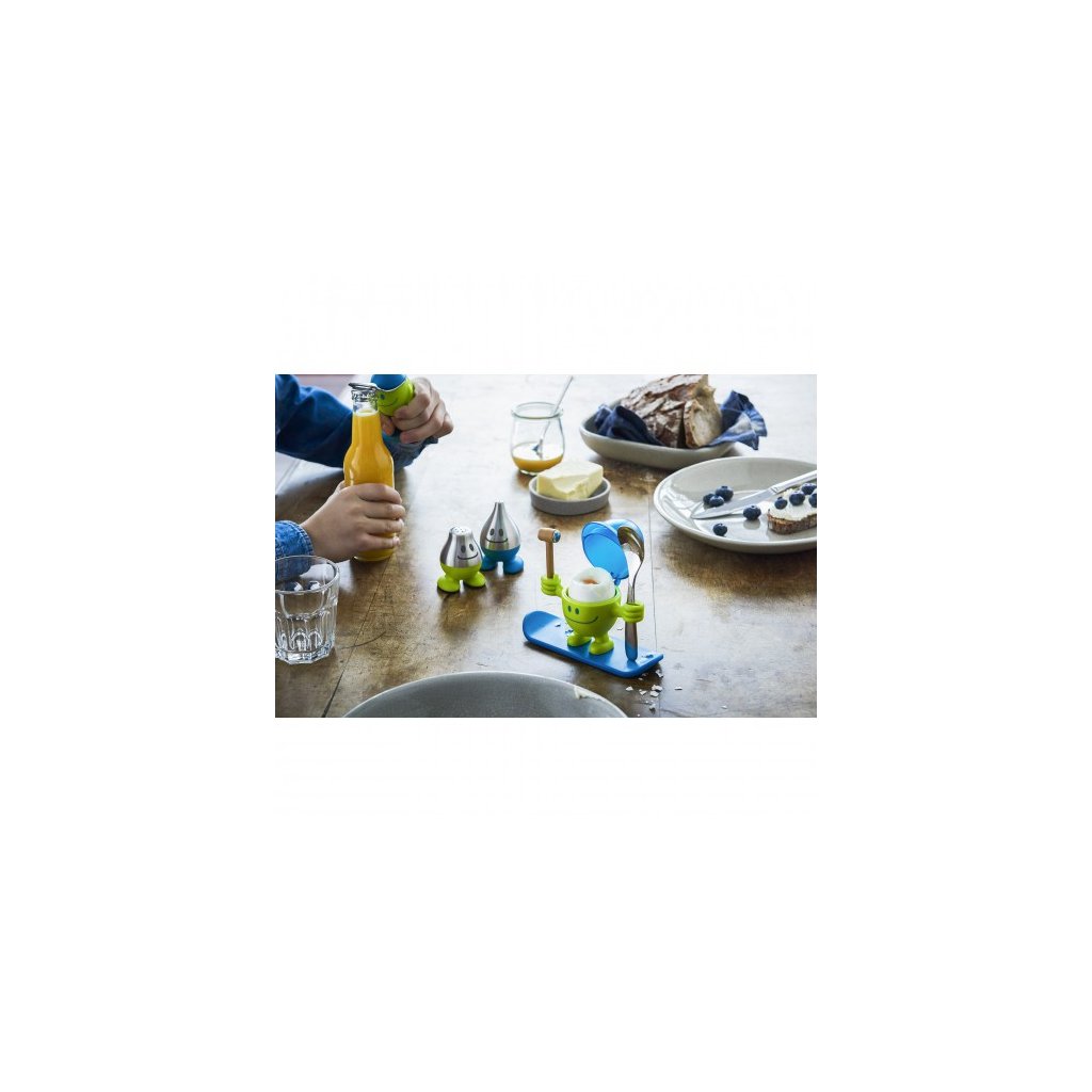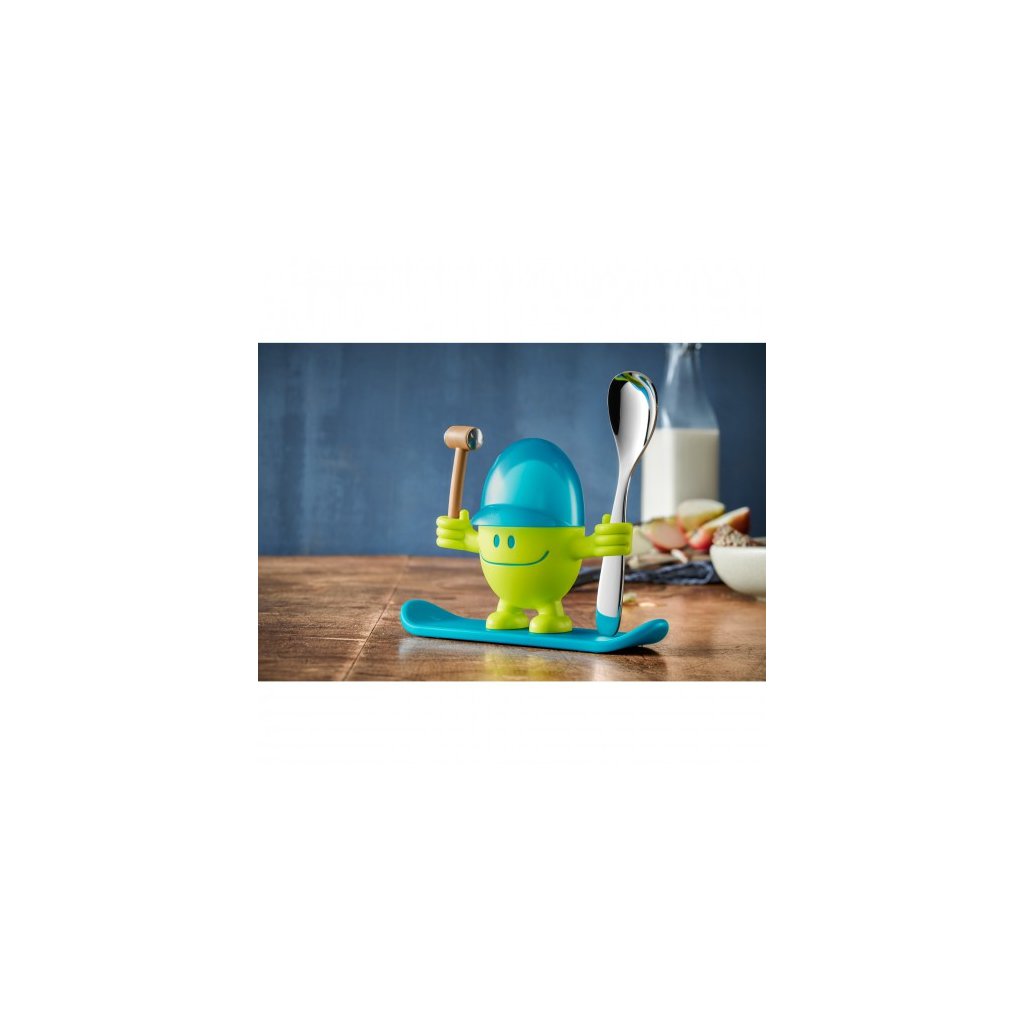 Stojanček na vajíčka „McEgg“ zelený, drzý stojanček na vajíčka pre deti. Stojí s kladivkom a lyžičkou na vajíčka, pripravený odštartovať raňajky! Pomocou kladivka môžete rozbiť škrupinku vajíčka, ktorá sa môže odkladať do čiapočky „McEgg“.