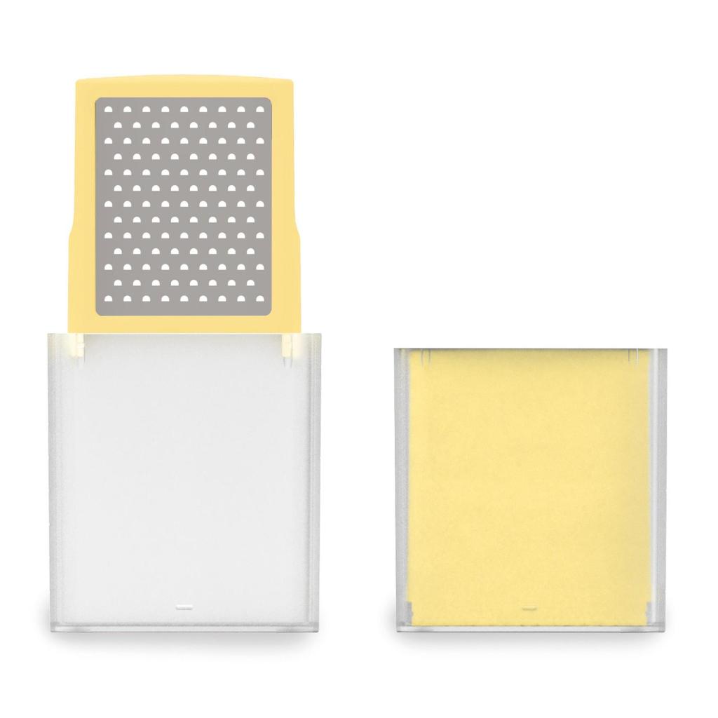 - Veko zásobníka pomáha uchovať čerstvo nastrúhaný syr v chladničke bez nutnosti prekladania do inej nádoby.