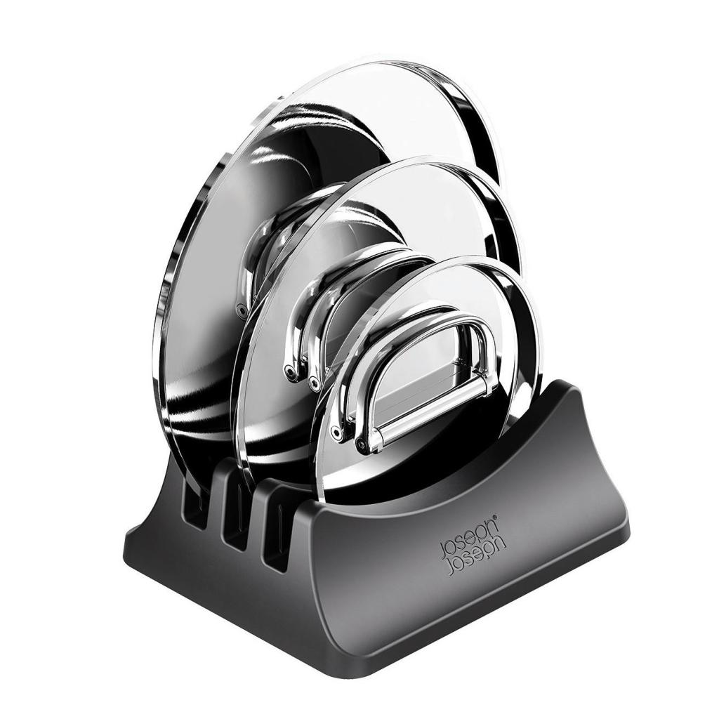 - Praktický stojan na pokrievka na hrniec pojme až tri pokrievka na hrniec a pomáha udržať prehľadné usporiadanie vo vnútri kuchynskej skrinky.