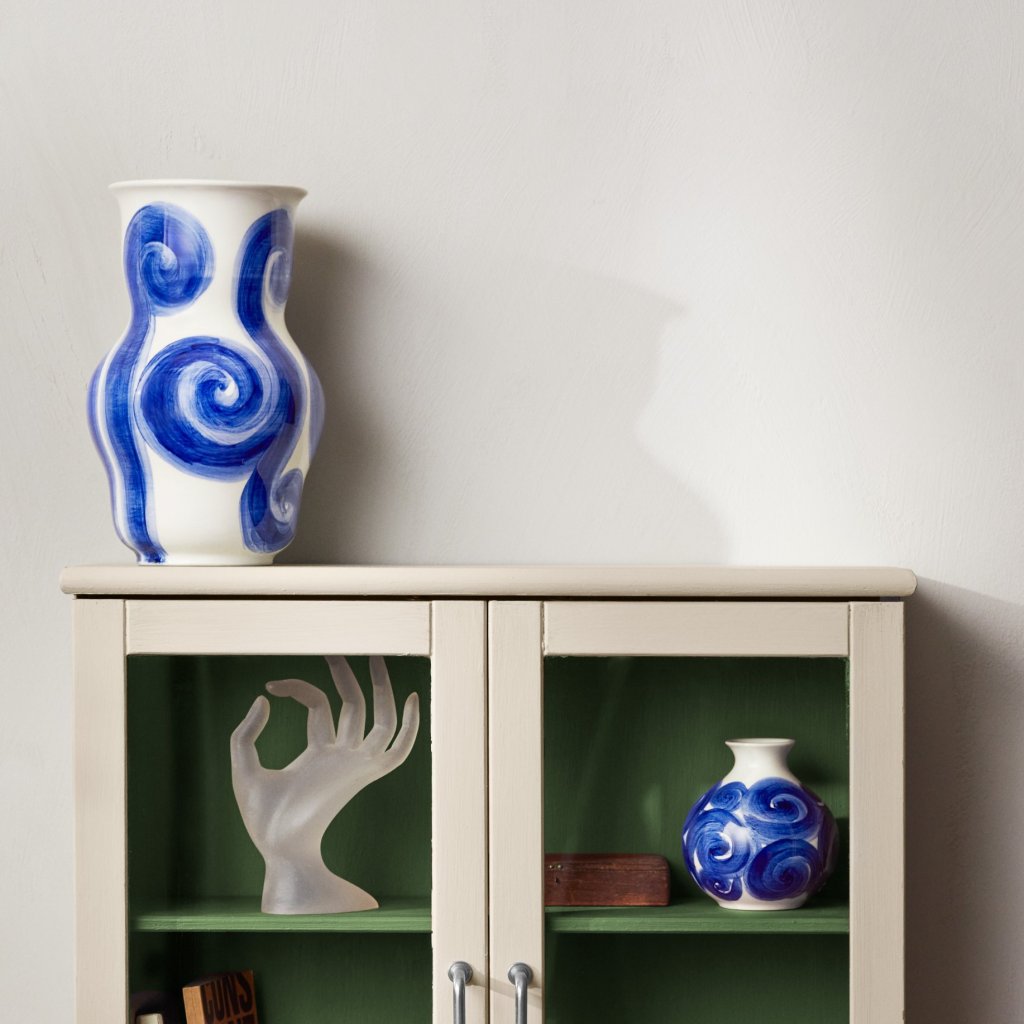 - každý kus je ručne maľovaný výraznými modrými špirálami na bielom podklade, čo z neho robí jedinečný dekoratívny predmet