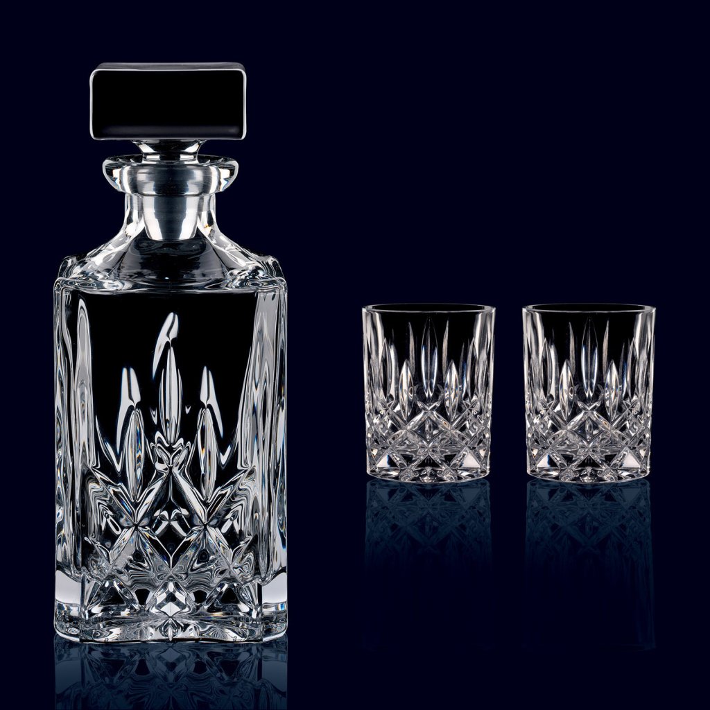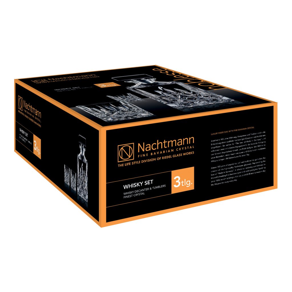 Trojdielna súprava na whisky zo série Noblesse od nemeckého výrobcu Nachtmann, ktorá obsahuje 2 poháre na whisky bez stopky a karafu na whisky s dekoratívnou zátkou z číreho skla, pozdvihne váš pôžitok z obľúbeného drinku o úroveň vyššie. Krištáľové sklo zdobené brúseným dekorom v klasickom pánskom štýle dodá punc vybranej elegancii akémukoľvek štýlu vybavenia.