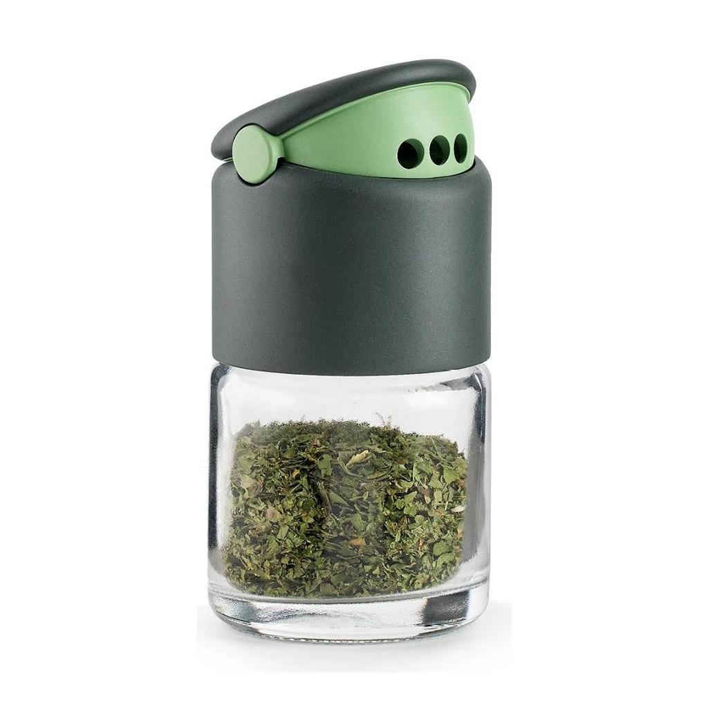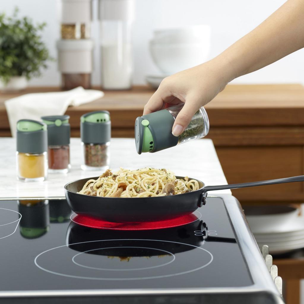 Keď máte v jednej ruke varešku av druhej paniku, posledné, čo potrebujete, je zásobník na korenie na gymnastiku prstov. Tento sivý dávkovač má veko, ktoré otvoríte jednoduchým kliknutím, a dve možnosti dávkovania, takže oregano neskončí na kuchynskej linke, ale tam, kde má byť - na jedle, nie v kronike kuchynských katastrof.